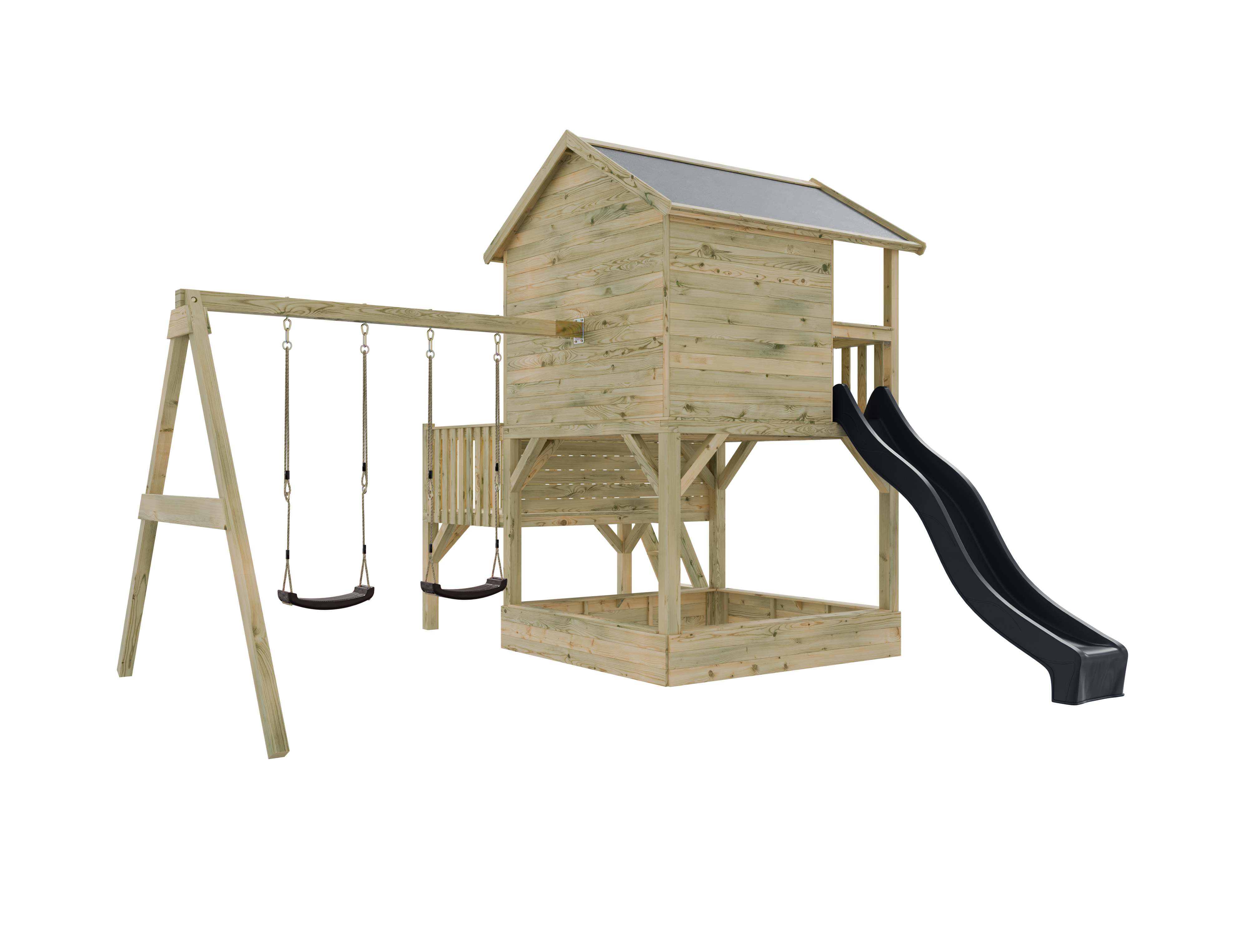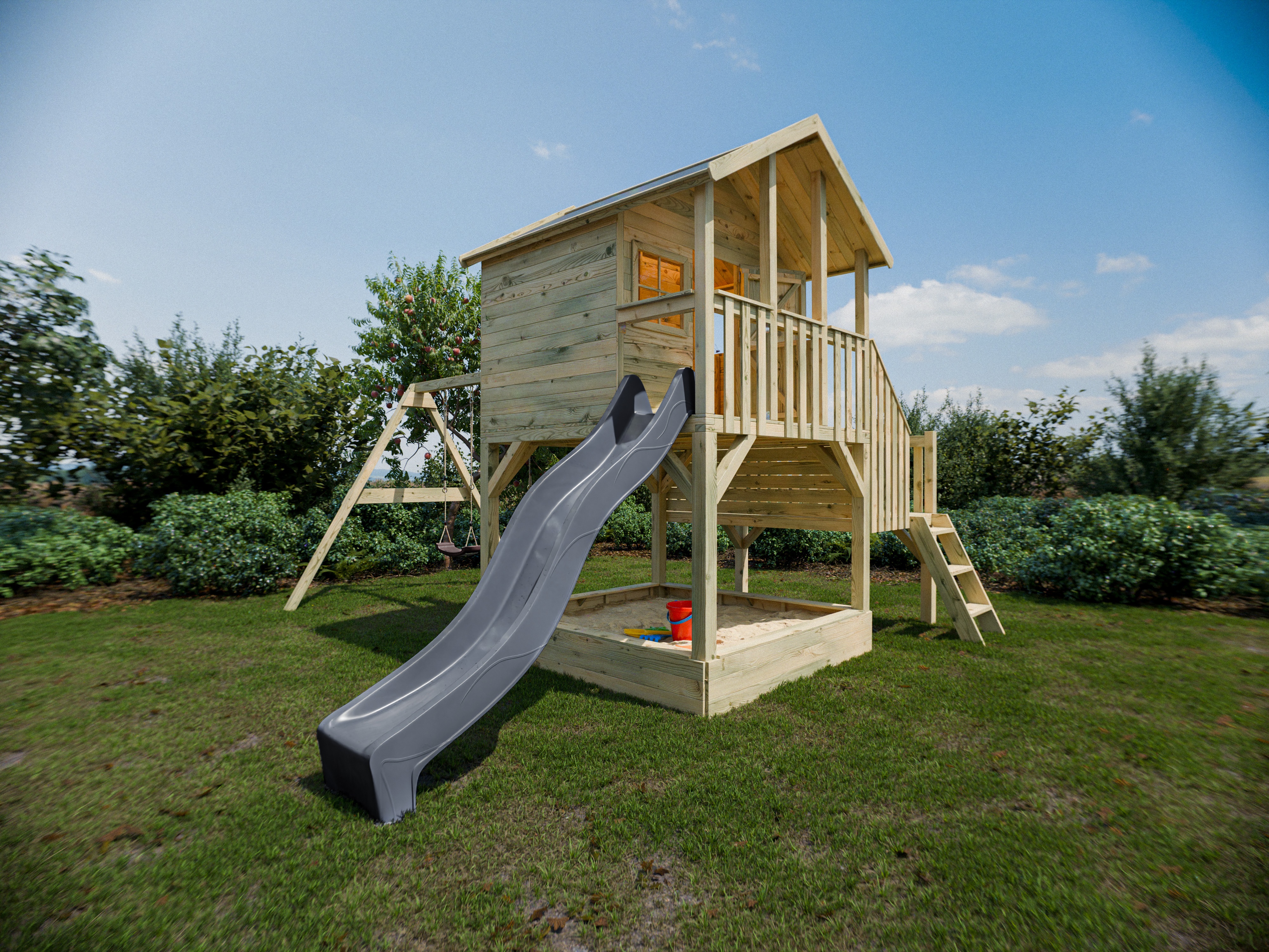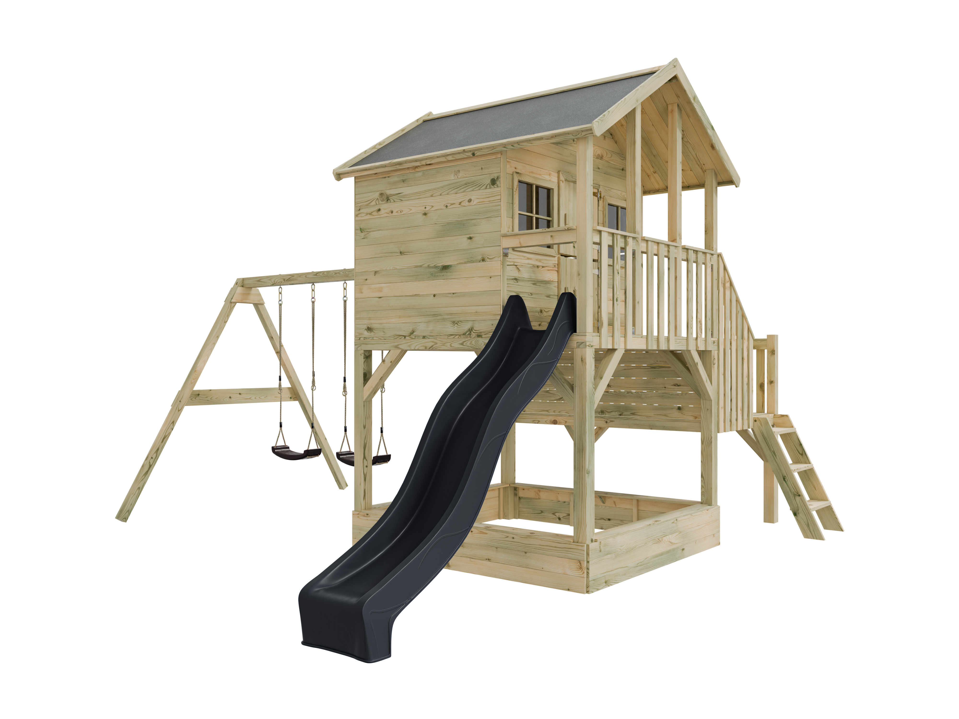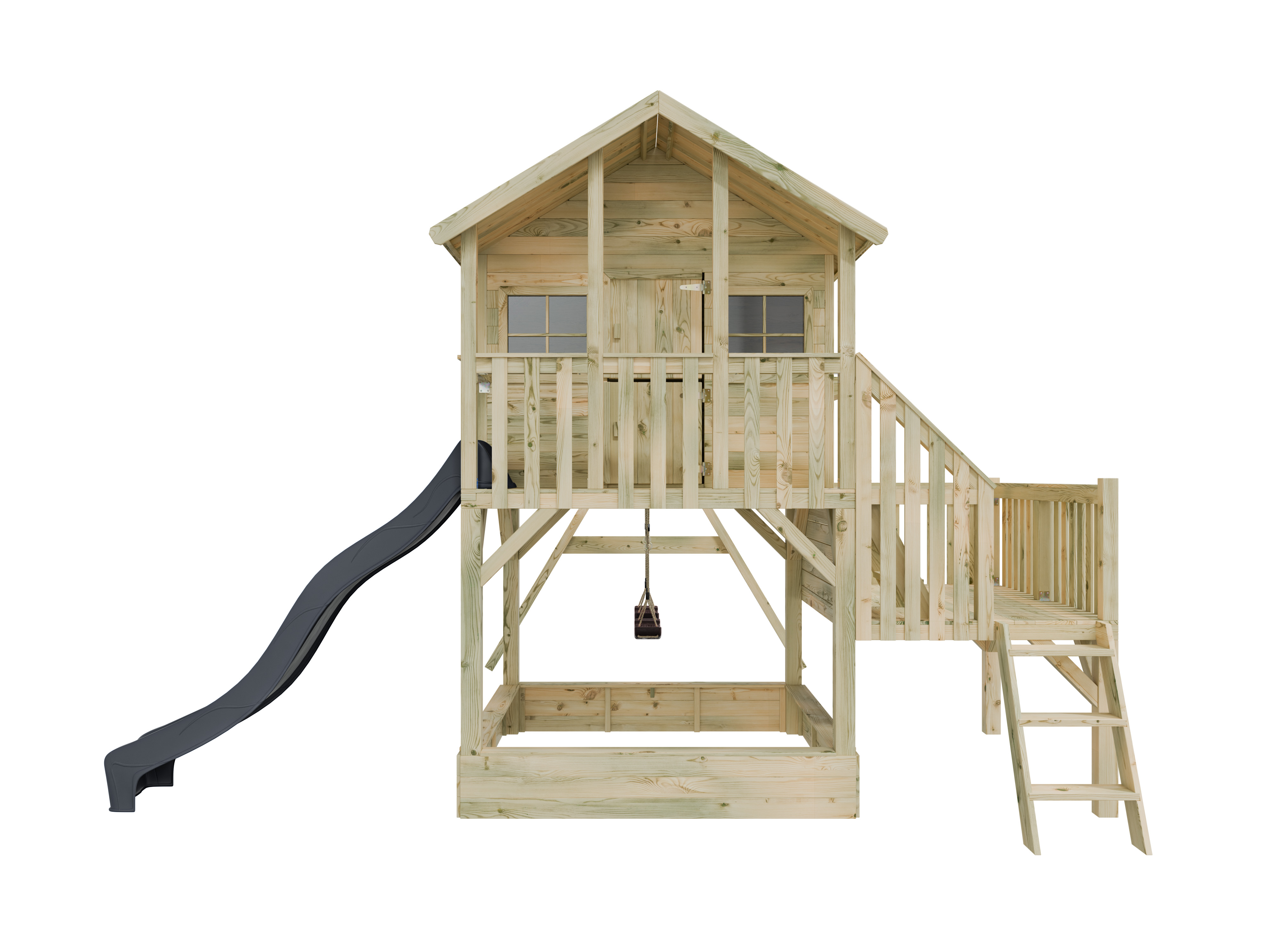 Maisonnette sur pilotis Big House L avec bac à sable (KDI), balançoire double et toboggan (gris)
