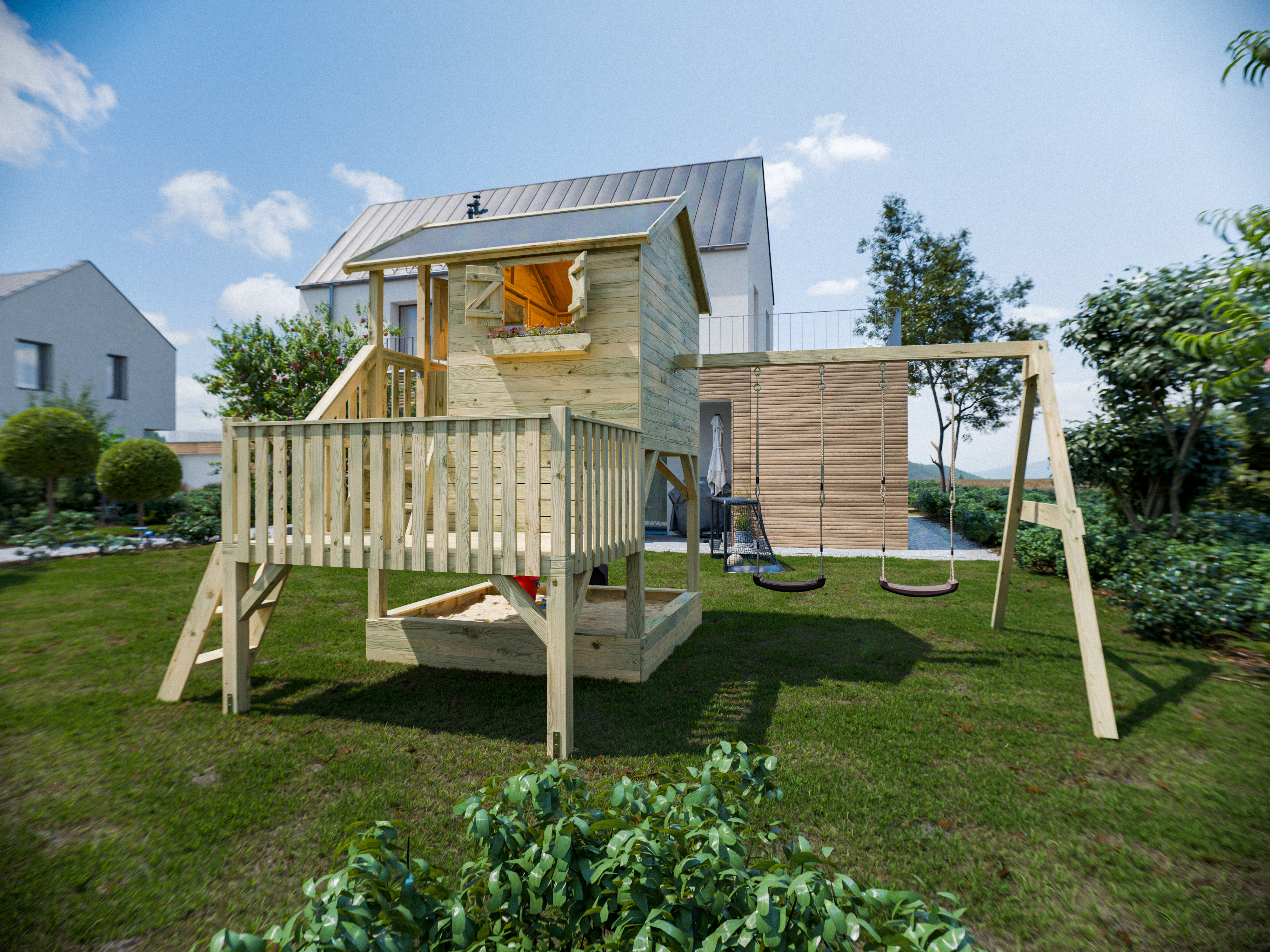 Cabane de jardin Prestige sur pilotis « Grande Maison L avec bac à sable » en pin traité sous pression, avec balançoire double et toboggan