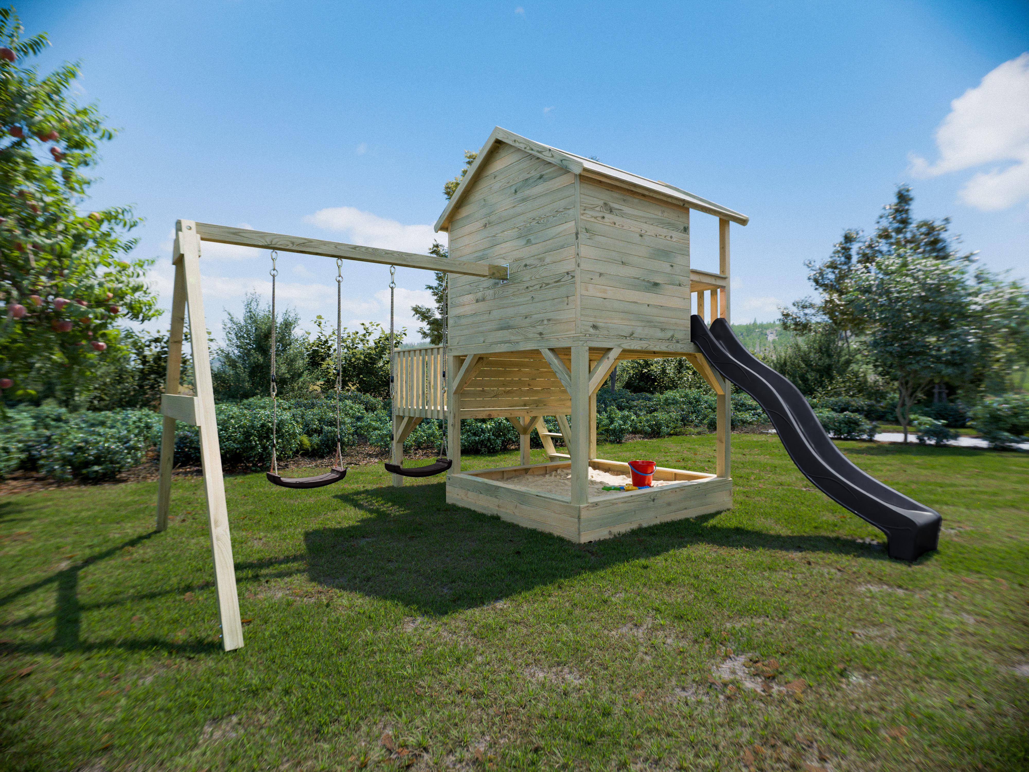 La plateforme abaissée de 90 cm de haut, accessible par deux petites marches, donne accès à la plateforme de 150 cm. Un toboggan à vagues « rocli » de 2,87 mètres de long est déjà inclus. Il peut être transformé en toboggan aquatique en quelques étapes simples. À cet effet, un raccord pour tuyau d'arrosage est prévu sous le toboggan et peut être installé en une seule opération de perçage. Le toboggan « rocli » se compose de trois parties emboîtables. Balançoire double incluse. La cabane est livrée avec une balançoire double (poteaux de 7 x 7 cm, traverse de 9 x 9 cm) comprenant deux sièges. Veuillez noter que la balançoire ne peut être installée qu'à l'arrière de la cabane, comme illustré. Pour des raisons de sécurité, son installation est impossible sur la paroi latérale avec la fenêtre ouverte. Traitement sous pression pour une durabilité accrue. La cabane est fabriquée en bois traité sous pression, ce qui la protège durablement des intempéries et des insectes. Une fois le bois complètement sec, vous pouvez la peindre. Découvrez notre gamme d'accessoires. Montage facile et rapide. Les instructions détaillées et claires permettent un montage rapide. facile à comprendre permet un montage rapide.