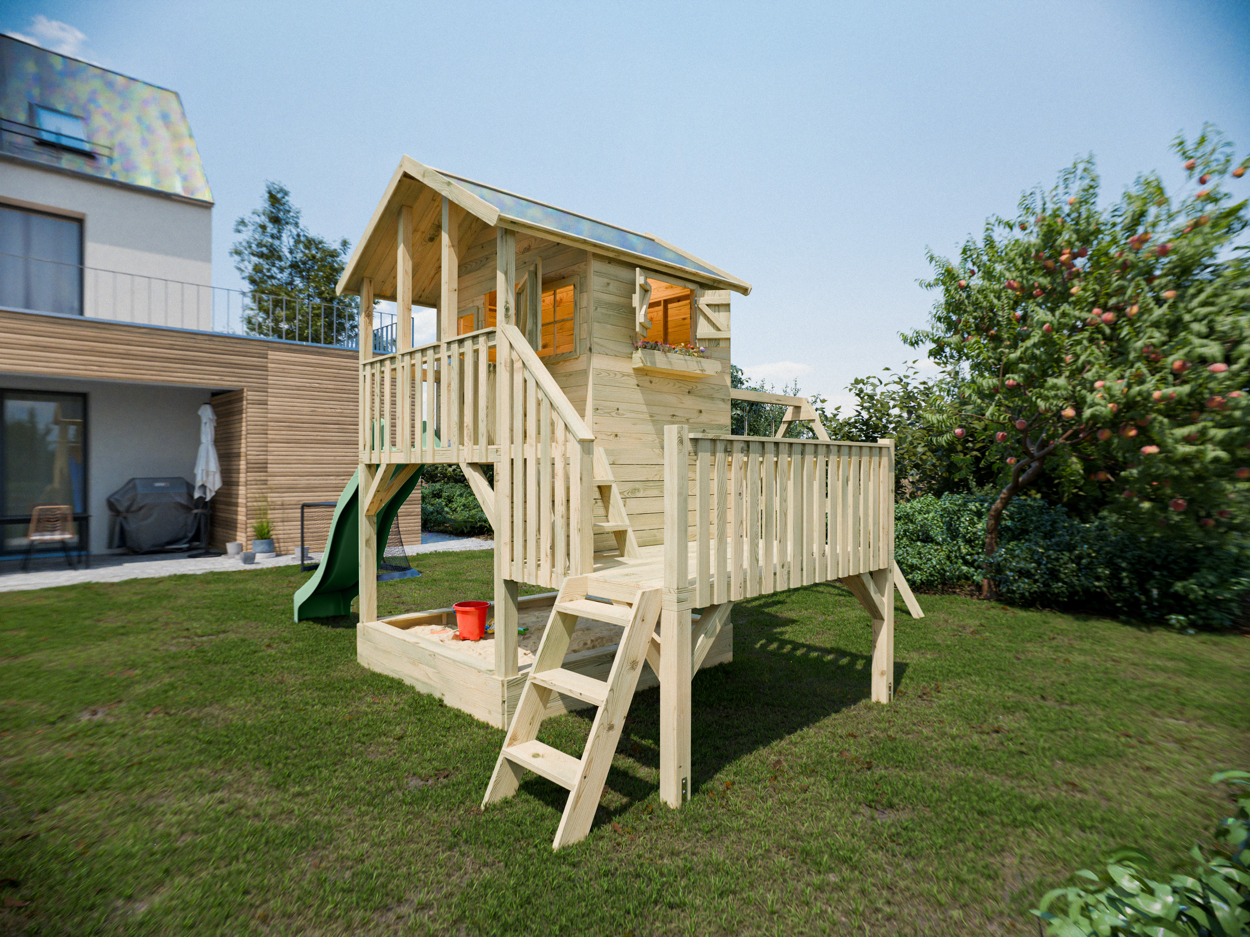 Cette cabane sur pilotis avec une véranda spacieuse est dotée d'une fenêtre à ouverture extérieure avec volets sur le côté et de deux fenêtres fixes en acrylique à l'avant. Une jardinière est également incluse. La cabane offre suffisamment d'espace pour plusieurs enfants et peut être agrandie selon leurs envies, par exemple avec une cuisine miniature. - Bac à sable inclus