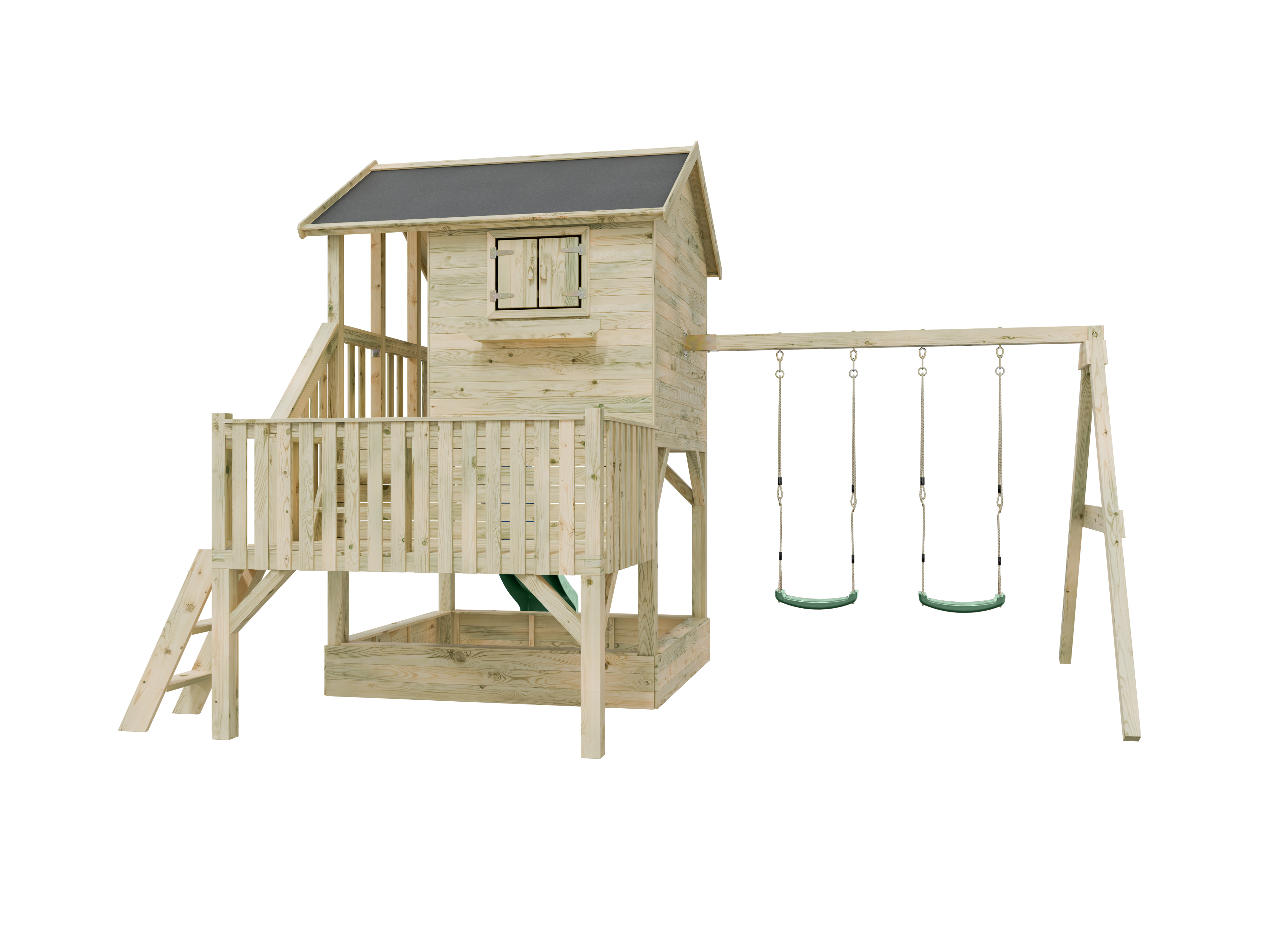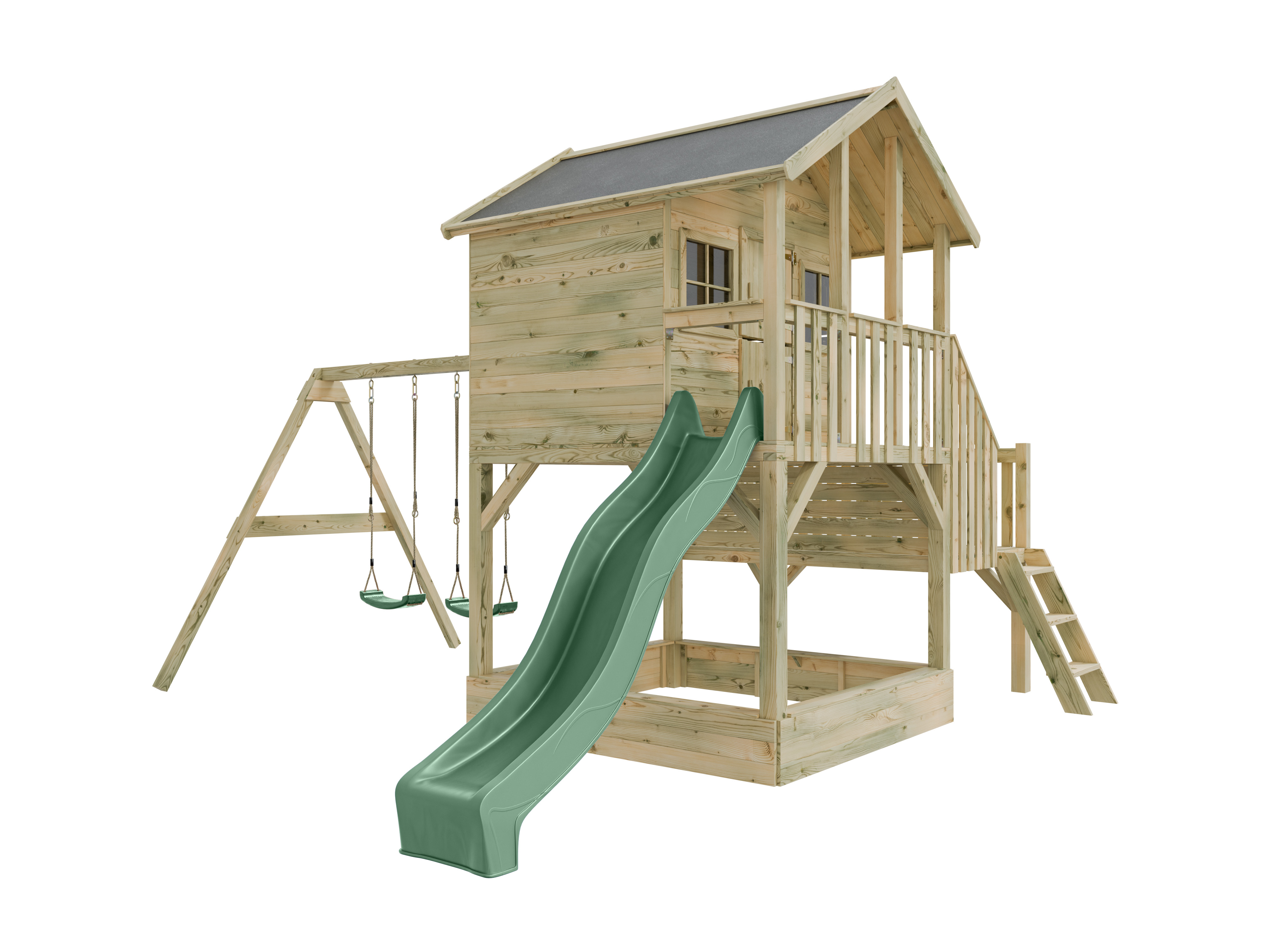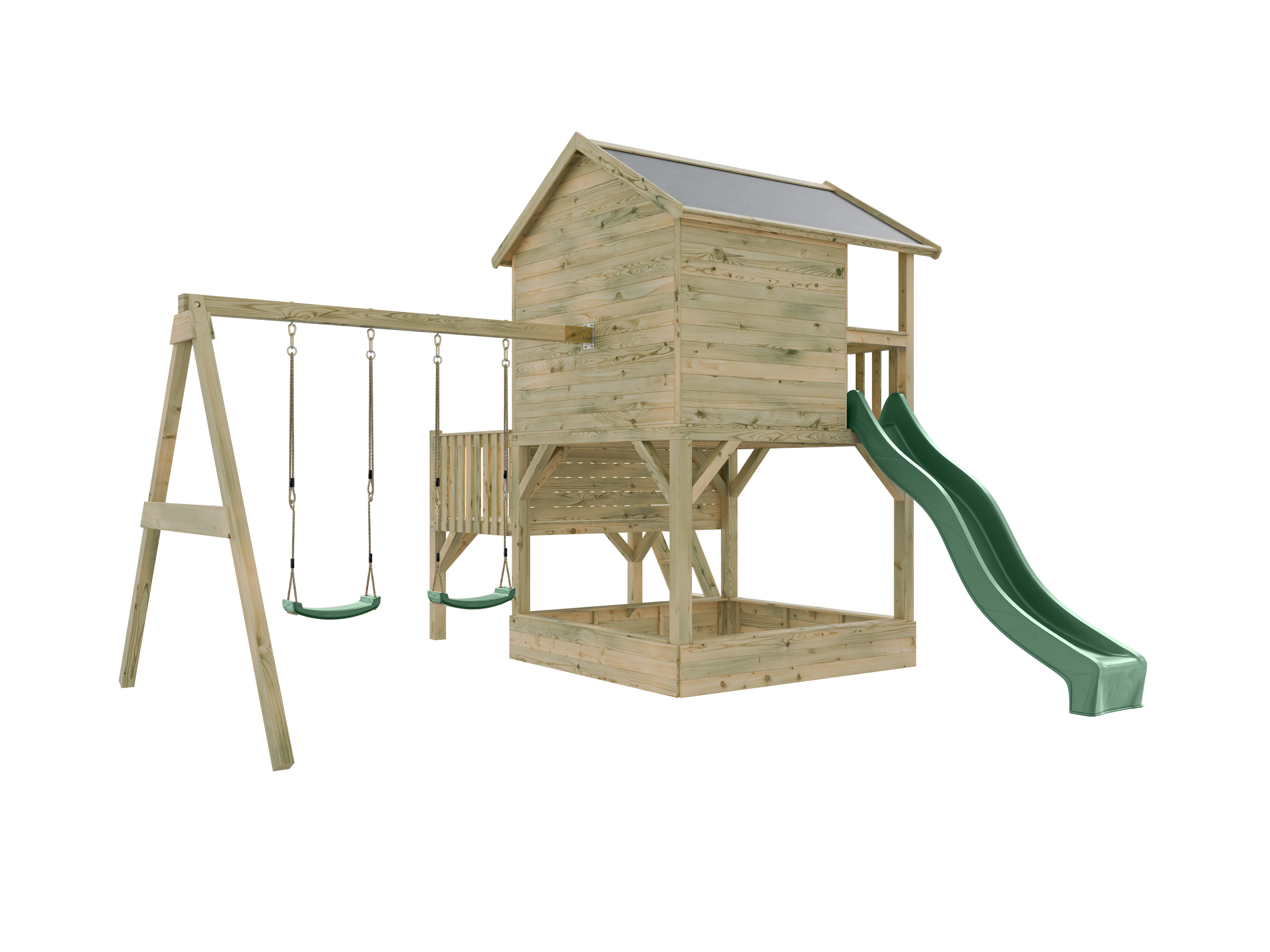 Maisonnette sur pilotis Big House L avec bac à sable (KDI), balançoire double et toboggan, vert past