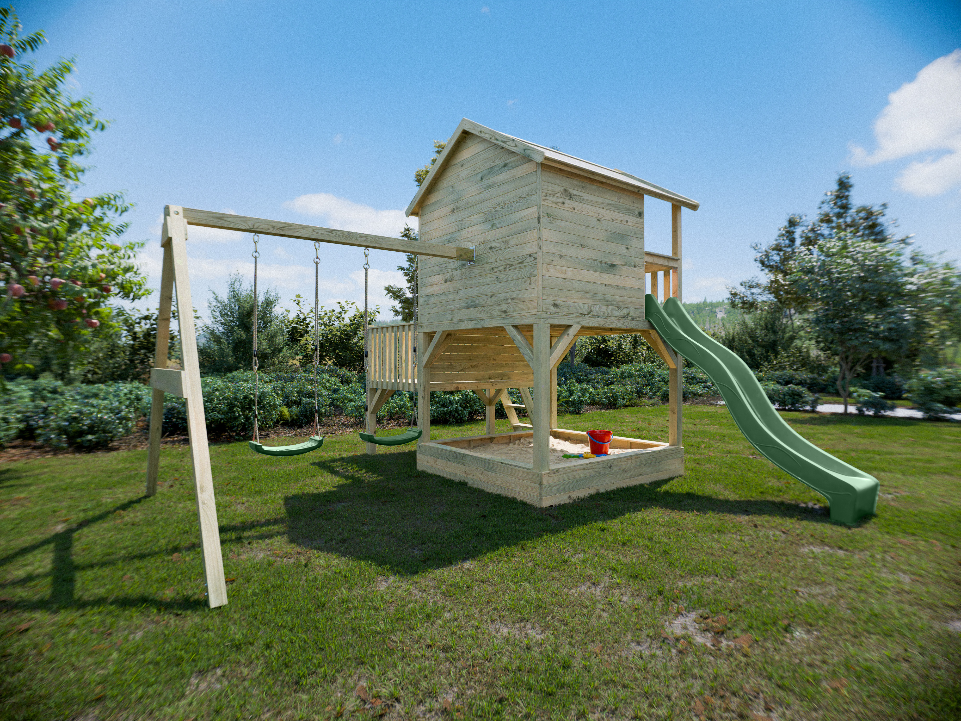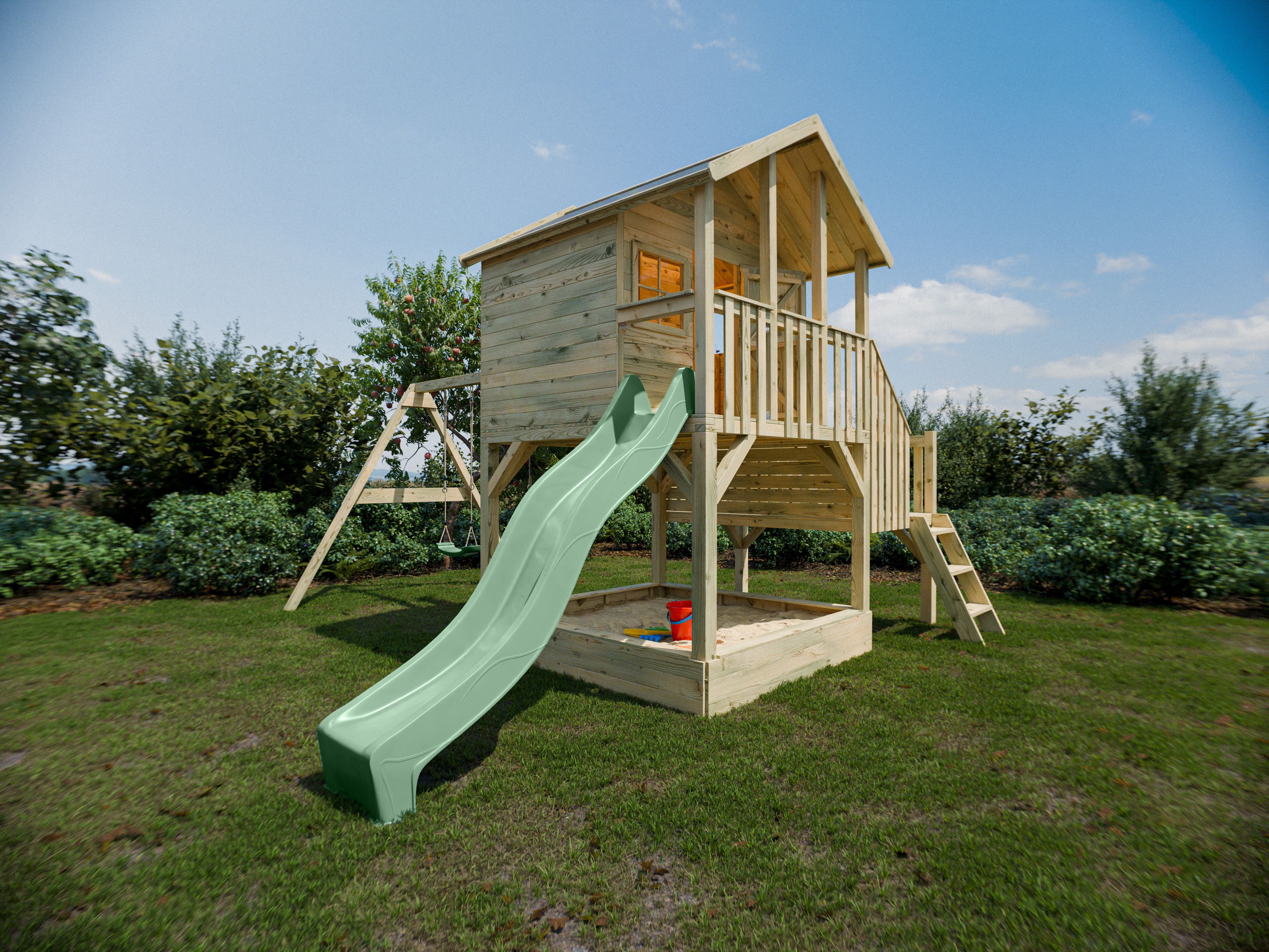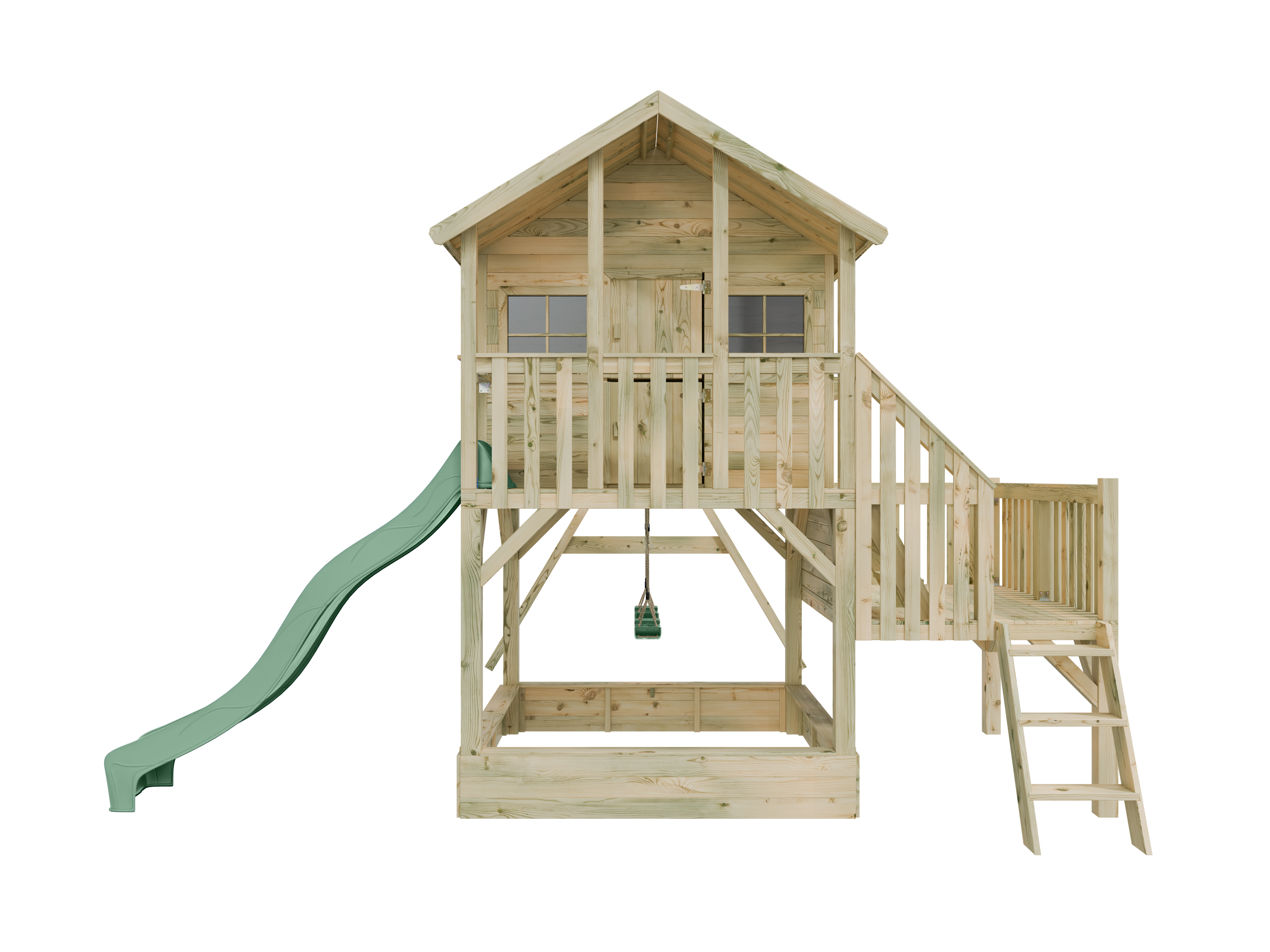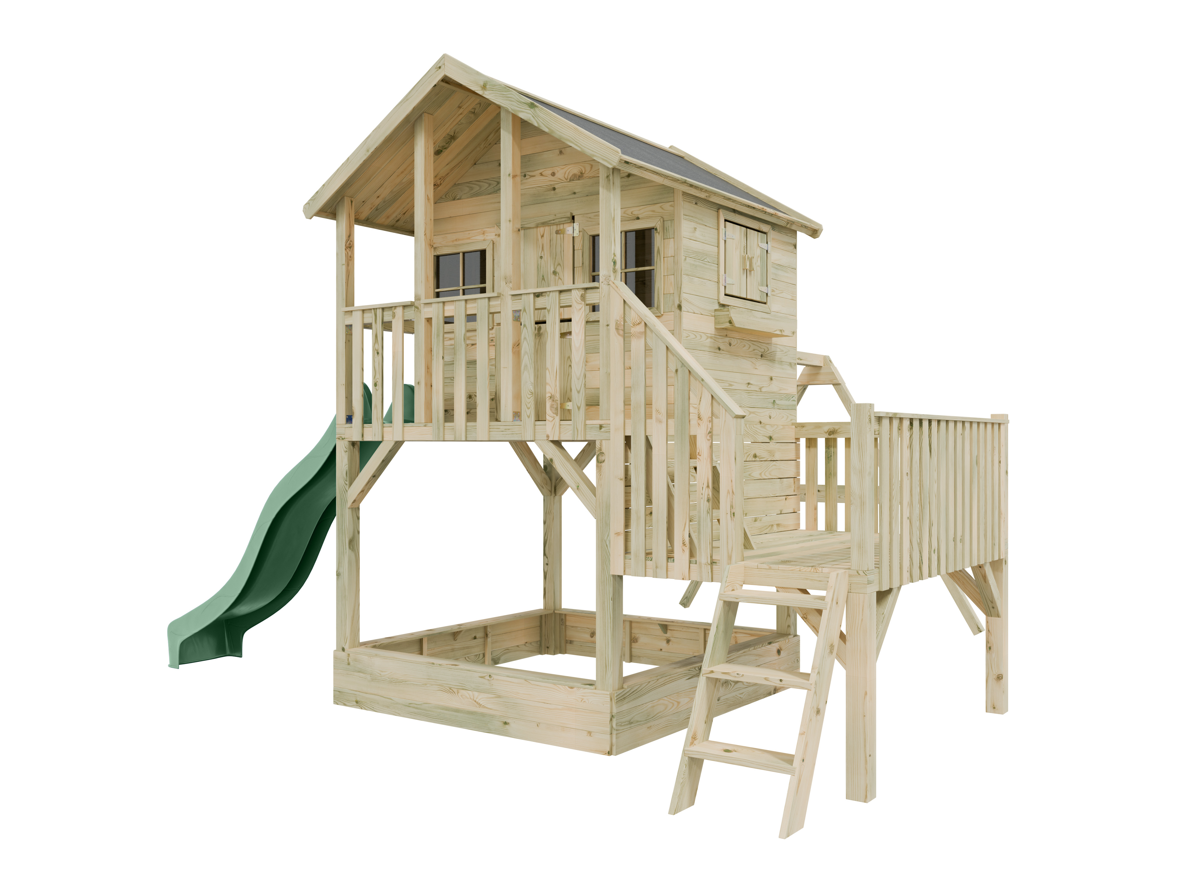 Maisonnette sur pilotis Big House L avec bac à sable (KDI), balançoire double et toboggan, vert past