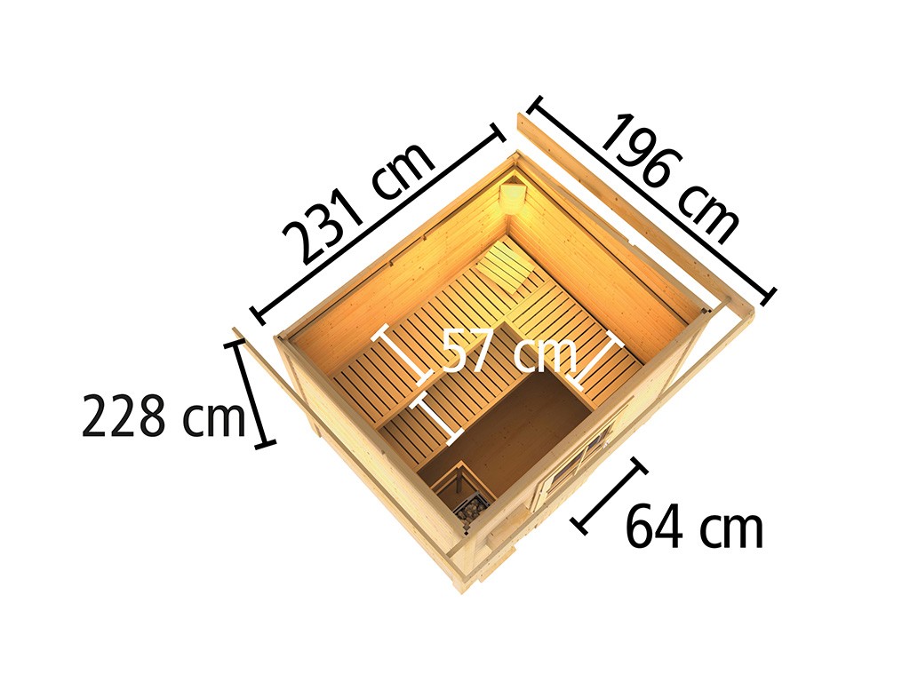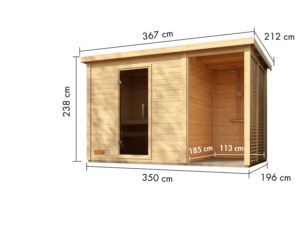 Dimensions (L x P x H) : 367 x 212 x 238 cm, avec 3 couchages, 2 appuie-têtes, poêle bio de sauna 9 kW et pierres de sauna