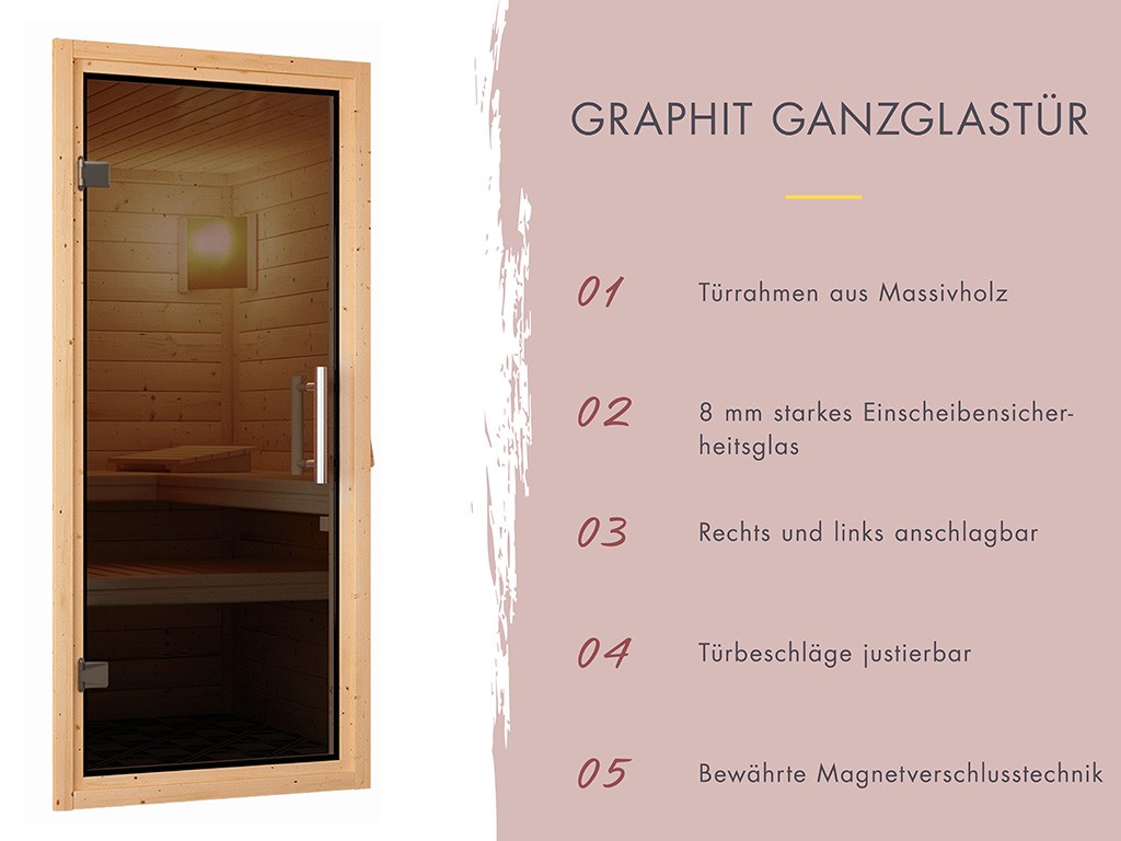 Ce modèle de sauna – un sauna modulaire ou sauna avec éléments préfabriqués – se distingue par sa construction en sandwich unique, c'est-à-dire que les éléments de paroi sont composés de couches individuelles. Les éléments de paroi préassemblés en épicéa permettent un montage rapide en quelques heures seulement. Avec une épaisseur de paroi de 38 mm, les saunas modulaires sont parfaitement isolés et donc particulièrement économes en énergie. Grâce à ces éléments très bien isolés, le sauna modulaire chauffe particulièrement vite.