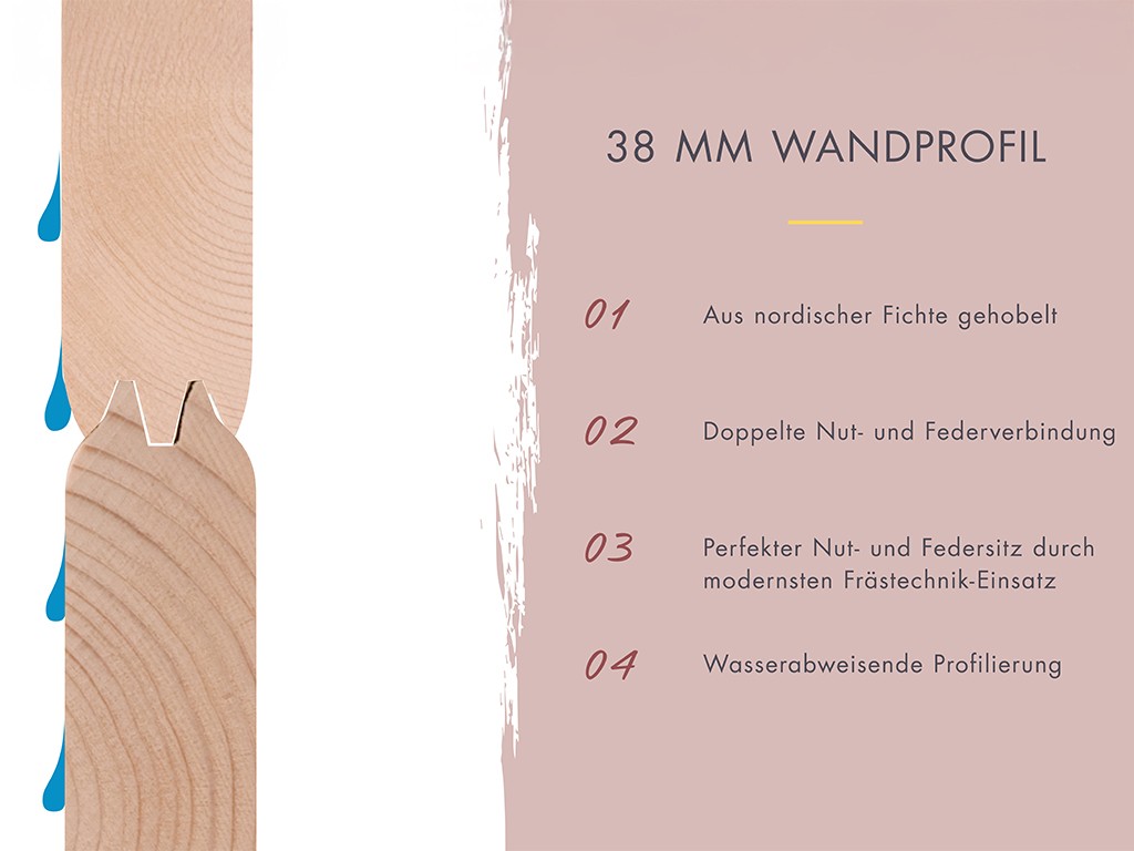 Les madriers massifs en épicéa nordique servent d’isolation naturelle. Pratiquement exempts de nœuds et de résine, avec un faible risque d’échardes, l’épicéa est un bois idéal pour un sauna. Sa bonne capacité d’accumulation de chaleur permet de conserver longtemps des températures élevées et de les restituer de façon homogène. L’expérience totalement naturelle d’un sauna en bois massif est complétée par les résines et huiles essentielles propres au bois, qui diffusent une odeur typique de bois.