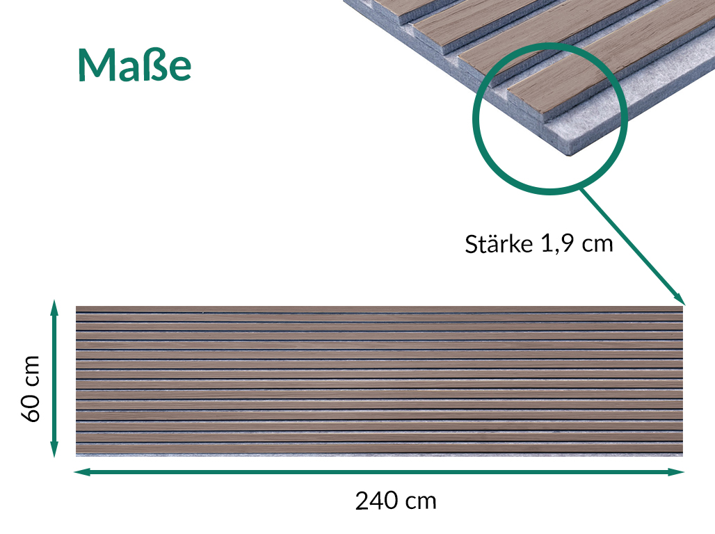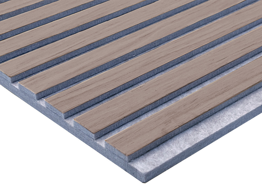 Les panneaux sont composés d'une plaque de support à trois faces en placage sur feutre gris, avec des lamelles en MDF de 9 mm. Cette structure particulière permet une régulation acoustique optimale et une réduction de la réverbération.