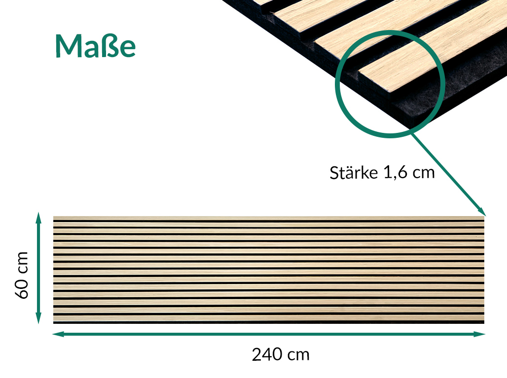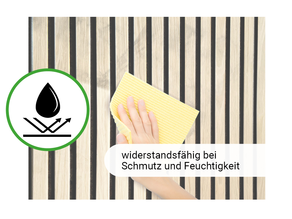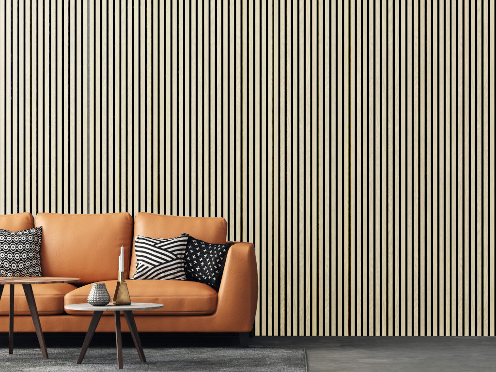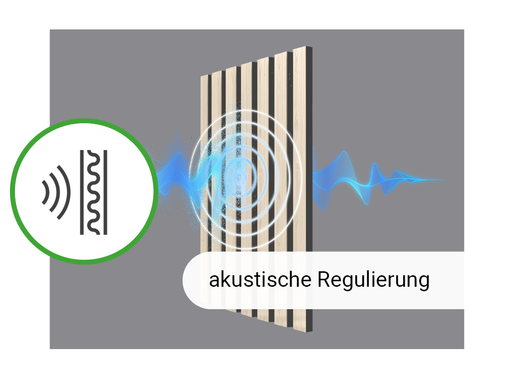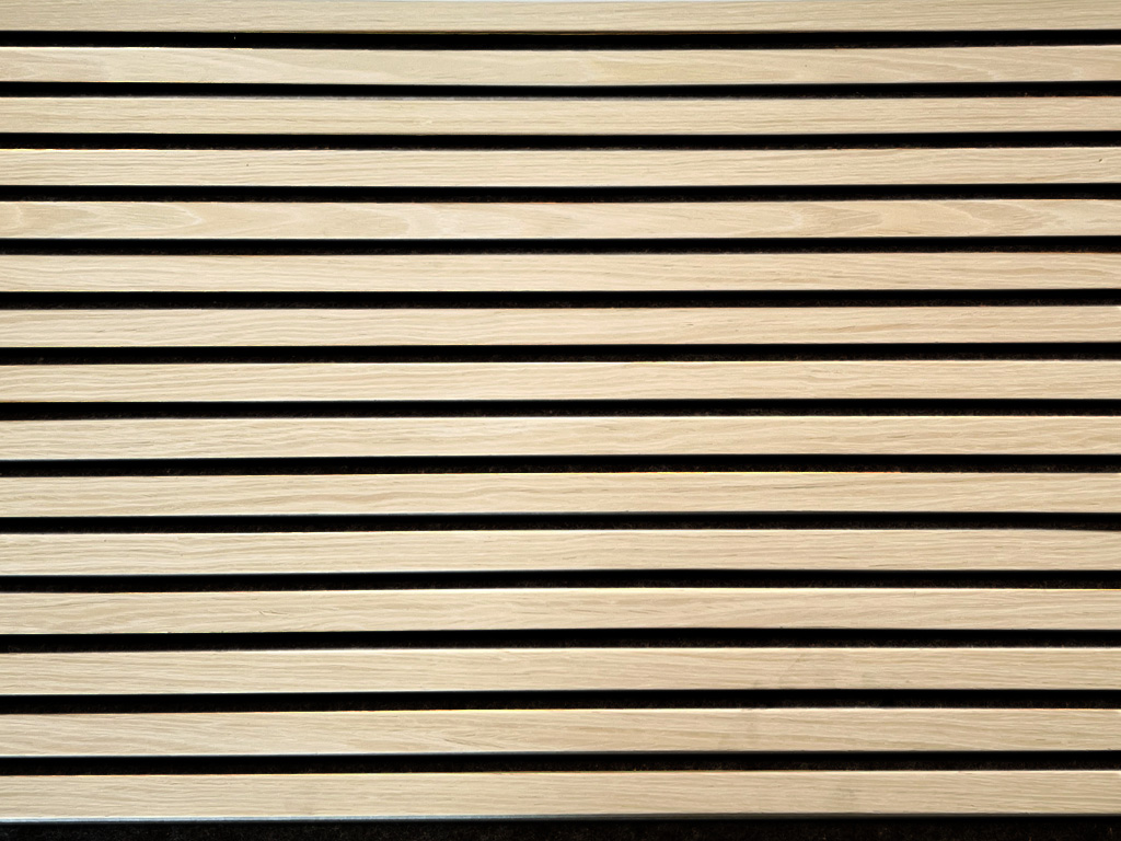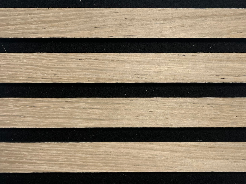 Les panneaux sont constitués d'une plaque de support en feutre polyester beige foncé avec des lamelles en MDF de 6 mm d'épaisseur. Cette structure particulière permet une régulation acoustique optimale et une atténuation de la réverbération.