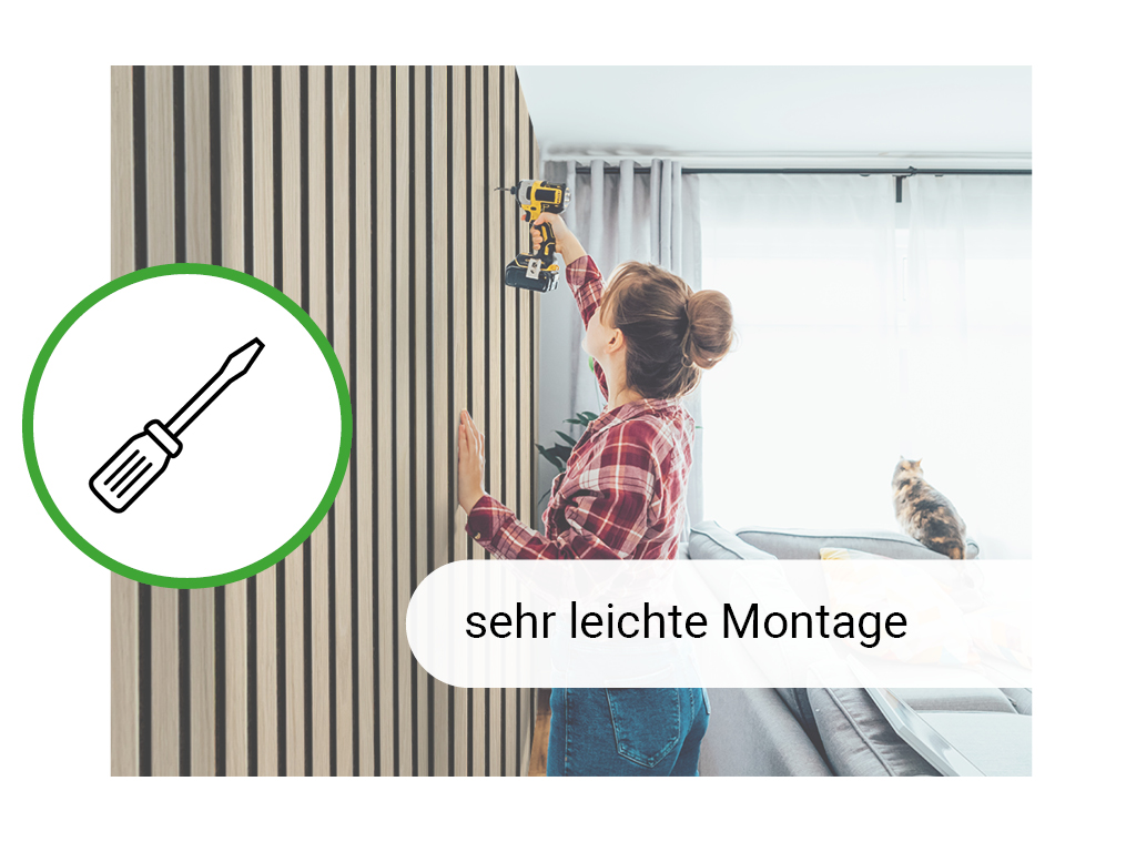 Les panneaux acoustiques sont livrés en plaques entières, ce qui rend l'installation très simple – ils peuvent être montés en un clin d'œil sur les murs ou plafonds. Déterminez d'abord l'orientation souhaitée des panneaux et ajustez-les si nécessaire. Ensuite, fixez-les au mur avec des vis ou de la colle – et c'est terminé !