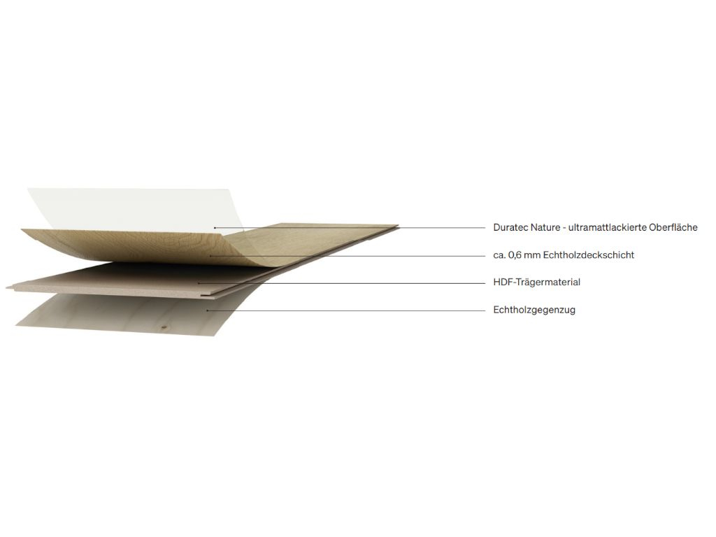 7,5 mm d'épaisseur, 109 x 21 cm, vernis ultra mat, brossé, rainure et languette, micro-joint sur 4 côtés
