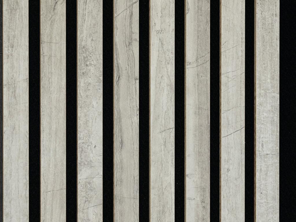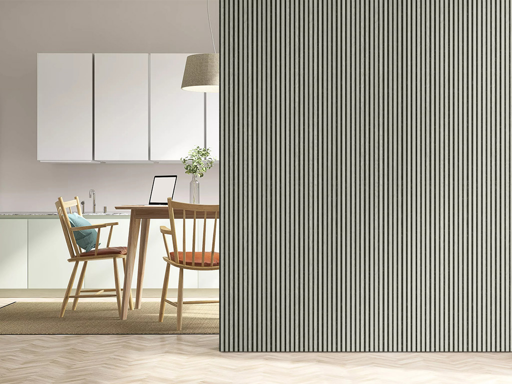 Les panneaux acoustiques sont utilisés pour la conception des murs et des plafonds. En outre, les caractéristiques acoustiques des produits sont mises en avant. Ces panneaux sont constitués d’une plaque porteuse en feutre noir qui absorbe les sons (végane) avec une proportion élevée (70 %) de matériau recyclé, sur lequel les lamelles (MDF) sont posées.