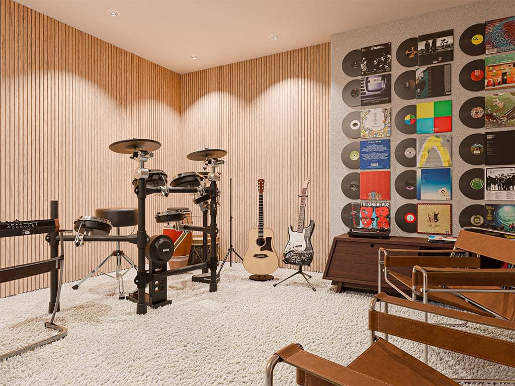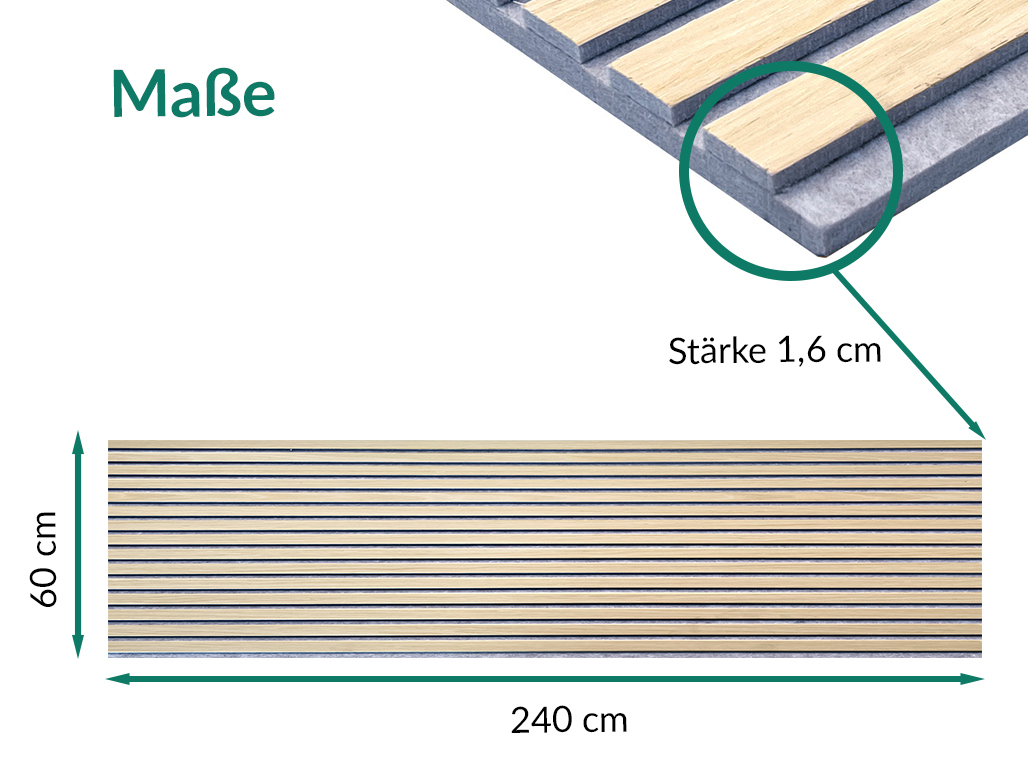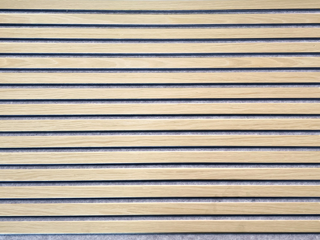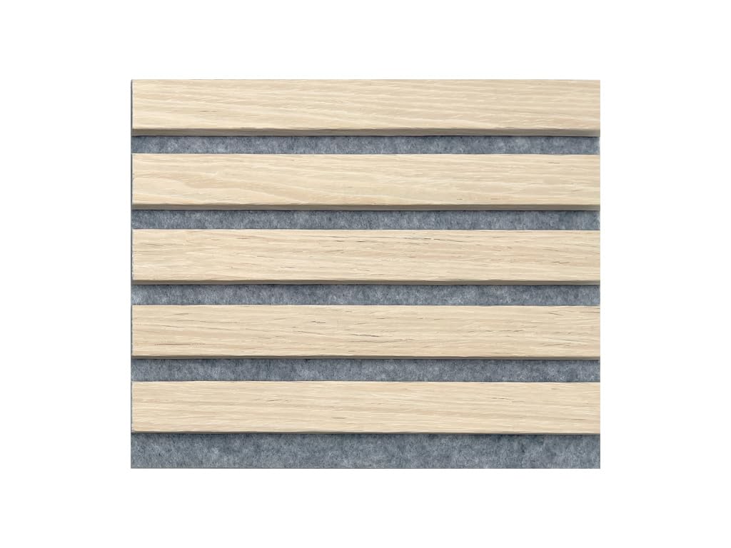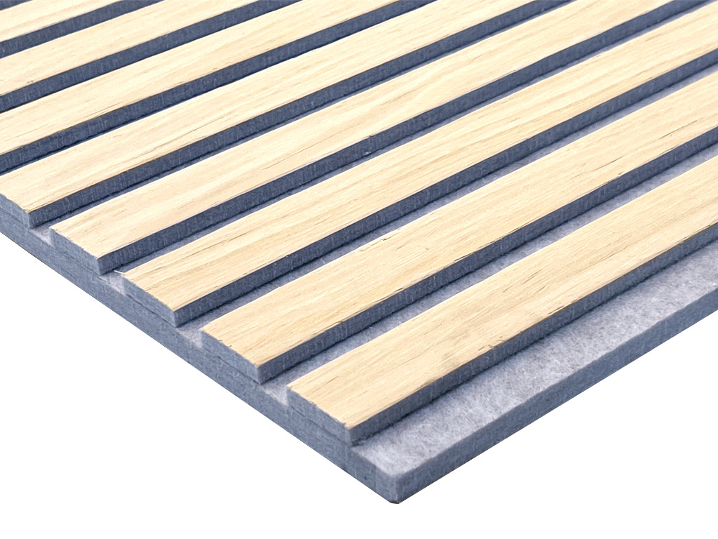 Les panneaux sont composés d'une plaque de support en MDF avec un placage d'un côté et du feutre noir, sur laquelle sont fixées des lamelles MDF de 6 mm d'épaisseur. Cette structure unique permet une régulation acoustique optimale et une diminution du temps de réverbération.
