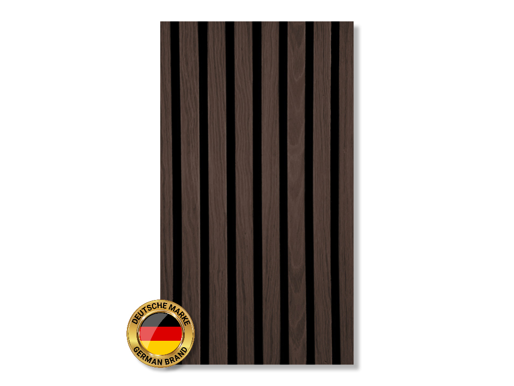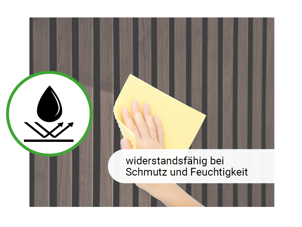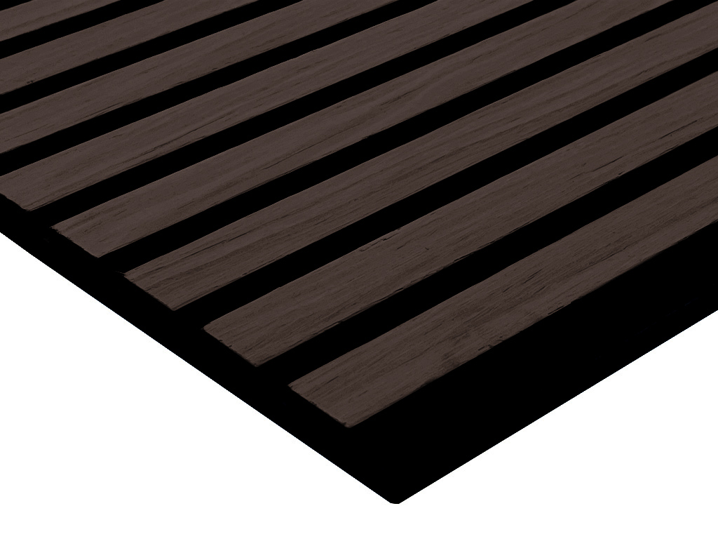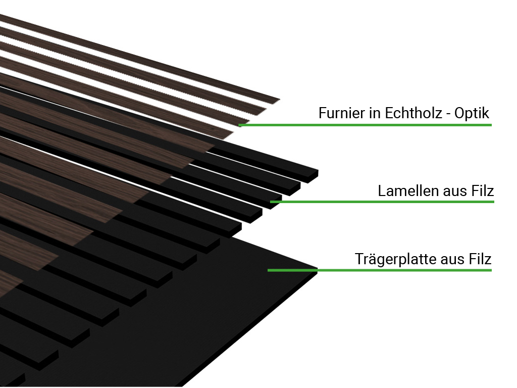 Les panneaux se composent d'une plaque de support avec placage sur trois côtés en feutre gris, sur laquelle sont fixées des lamelles MDF de 9 mm. Cette structure unique garantit une régulation acoustique optimale et une diminution de la réverbération.