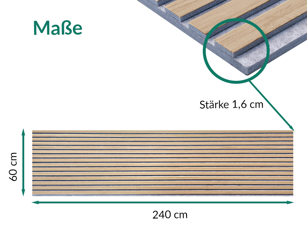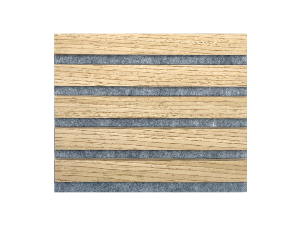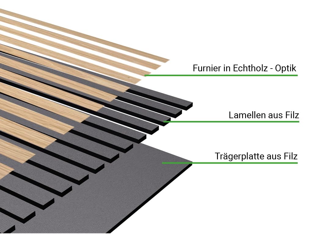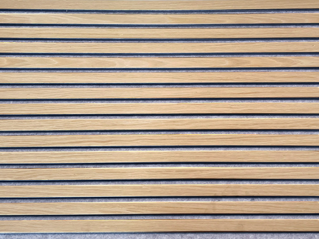 Les panneaux se composent d'une plaque de support en feutre noir revêtu sur un côté, sur laquelle sont fixées des lamelles en MDF de 6 mm d'épaisseur. Cette structure spécifique permet une régulation acoustique optimale et une réduction du temps de réverbération.