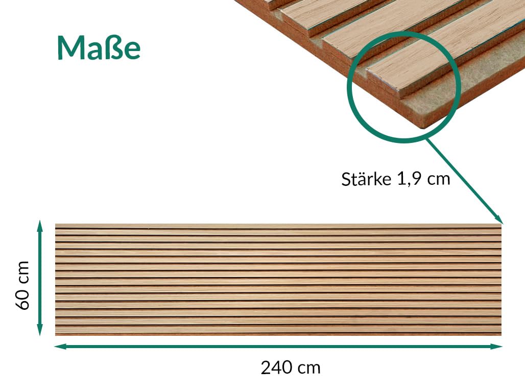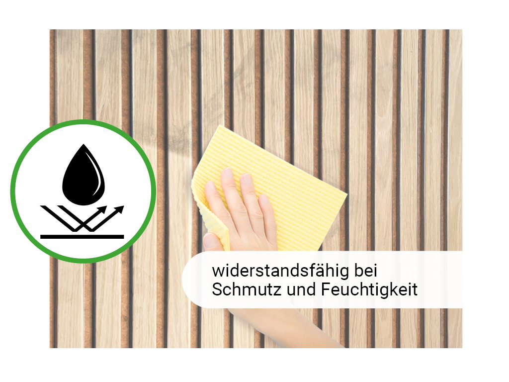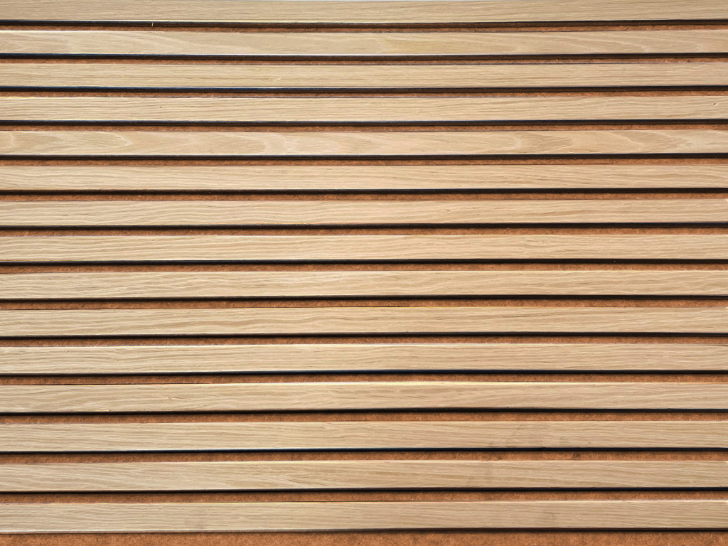 Les panneaux se composent d'une plaque de support en feutre beige, revêtue sur 1 côté, sur laquelle sont fixées des lamelles MDF de 6 mm. Cette structure particulière permet une régulation acoustique optimale et une réduction du temps de réverbération.