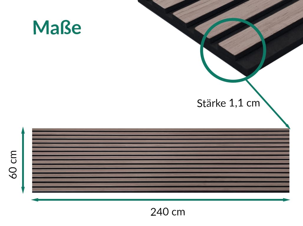 Les panneaux sont constitués d'une plaque de support de 5 mm en feutre noir, avec des lamelles de MDF de 6 mm. Cette structure particulière permet une régulation acoustique optimale et une atténuation du temps de réverbération.