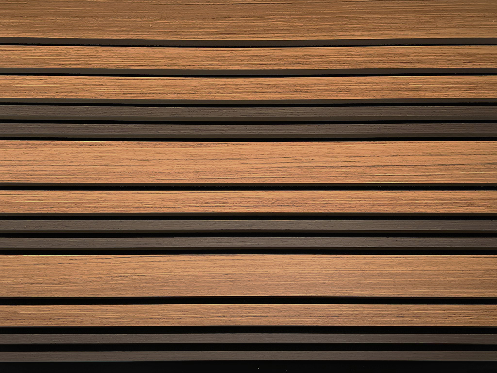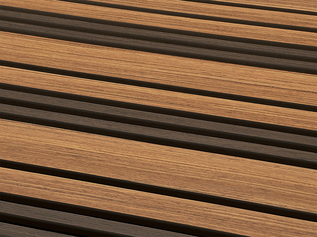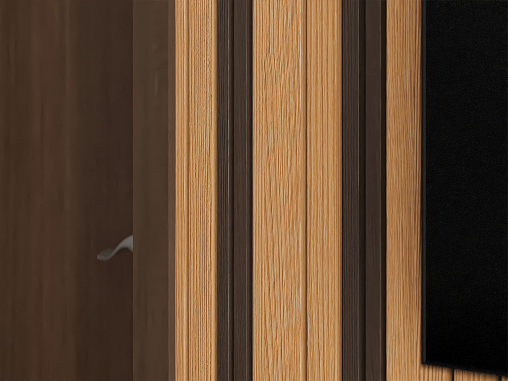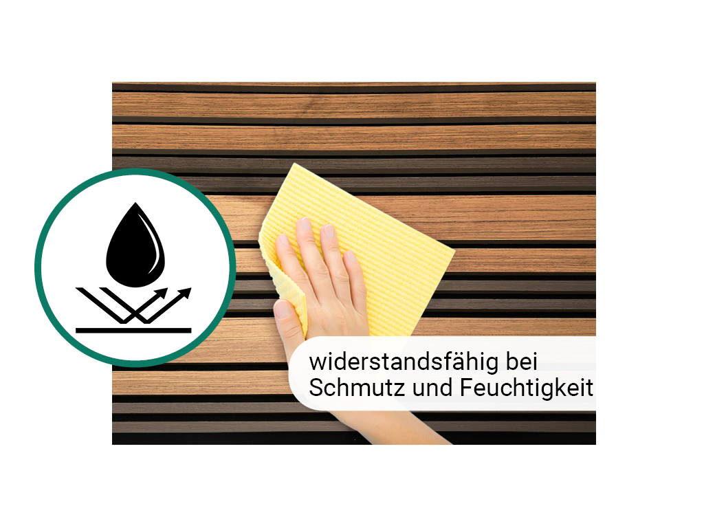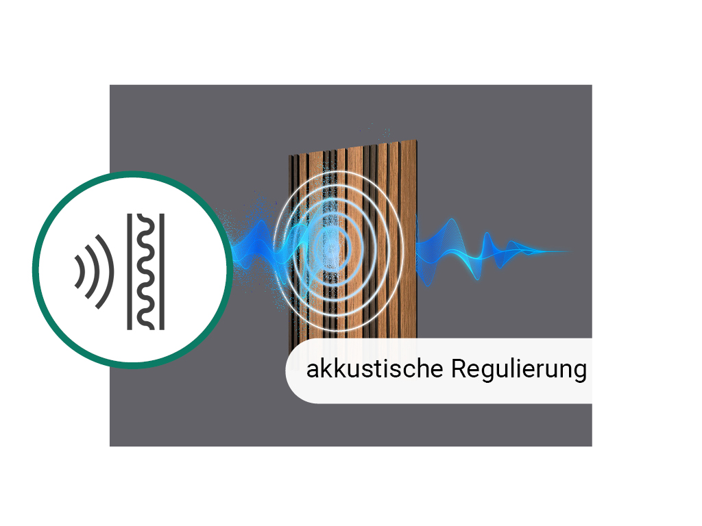 Les panneaux acoustiques sont utilisés pour la conception des murs et des plafonds. En outre, les propriétés acoustiques des produits sont au premier plan. Les panneaux sont constitués d’une plaque de support noire en polyester recyclé et insonorisant, sur laquelle sont fixées des lamelles (MDF) plaquées avec du chêne sans nœuds : le bois pour lamelles et placages provient exclusivement de forêts gérées de manière exemplaire.