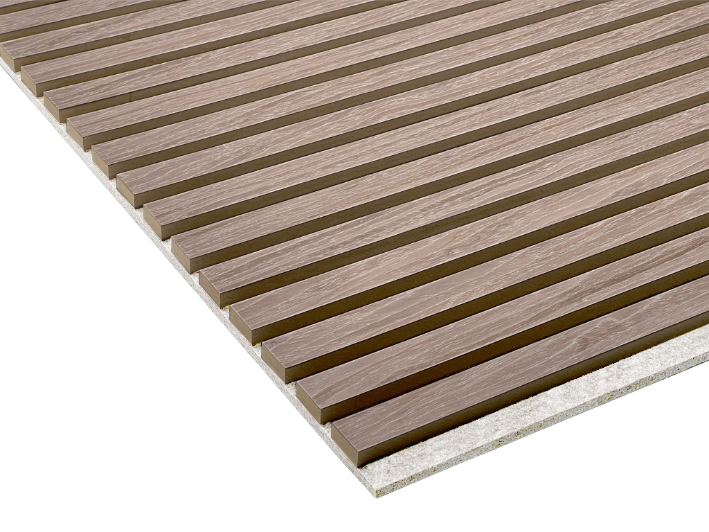 Les panneaux acoustiques sont utilisés pour la conception des murs et des plafonds. En outre, les propriétés acoustiques des produits sont au premier plan. Les panneaux sont constitués d’une plaque de support gris clair en polyester recyclé et insonorisant, sur laquelle sont fixées des lamelles (MDF) plaquées avec du chêne sans nœuds : le bois pour lamelles et placages provient exclusivement de forêts gérées de manière exemplaire.