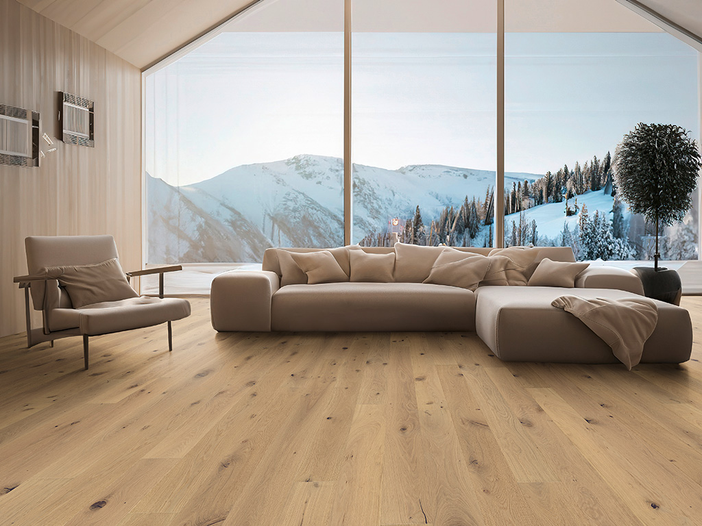 Les parties tendres du bois en surface ont été brossées, révélant une texture marquée composée de bois plus dur. La surface des lames reçoit une finition vernie mate, gage d’une grande longévité et d’un entretien aisé.