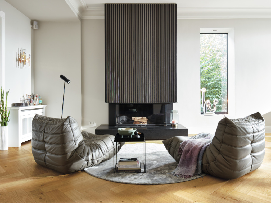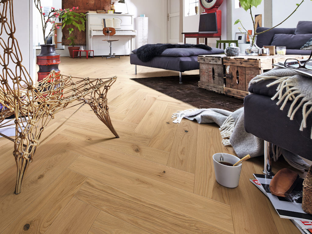 - Parquet haut de gamme : format en chevron classique, interprété de manière moderne