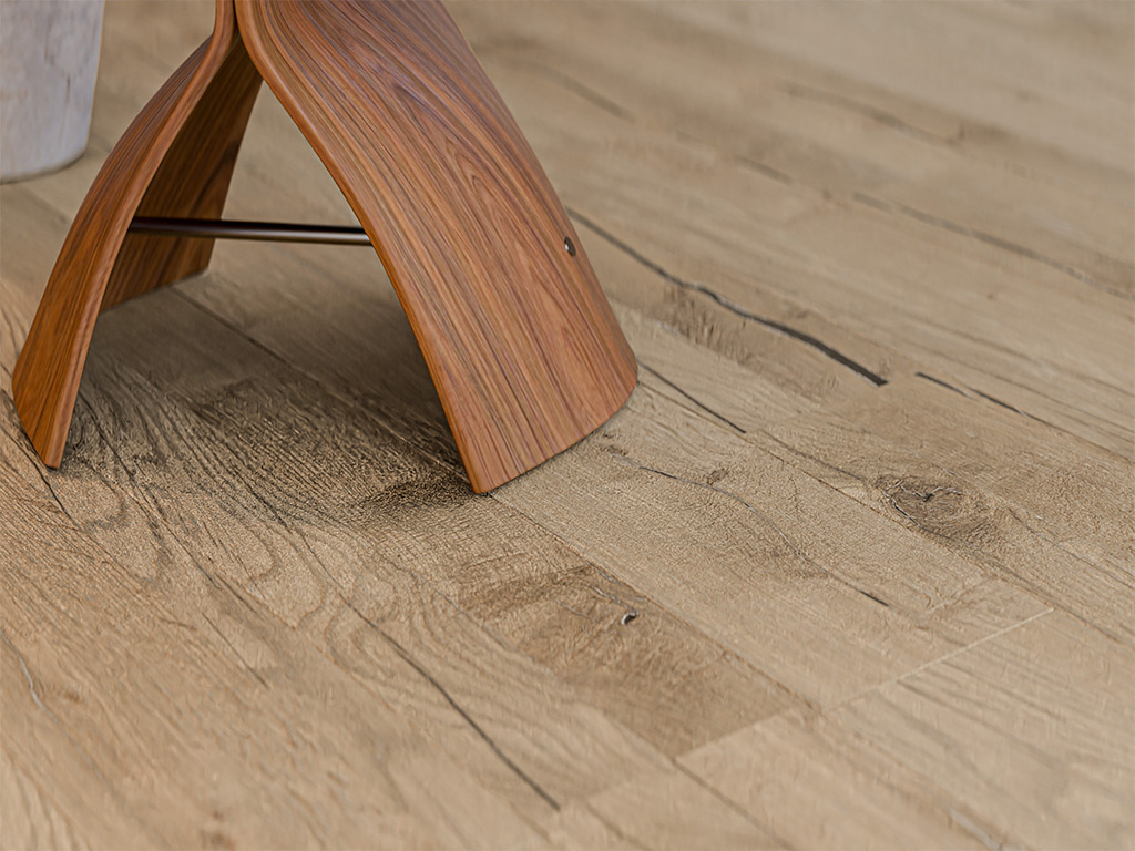 Ce parquet présente un veinage sauvage : de nombreux nœuds et grandes fissures naturelles se trouvent dans le bois.