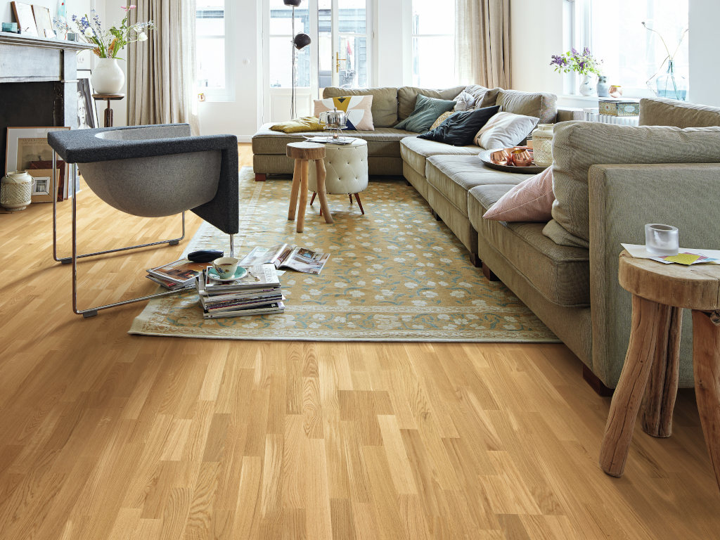 La couche supérieure de 2,5 mm de ce parquet prêt à l'emploi, facile à entretenir, est en chêne véritable.