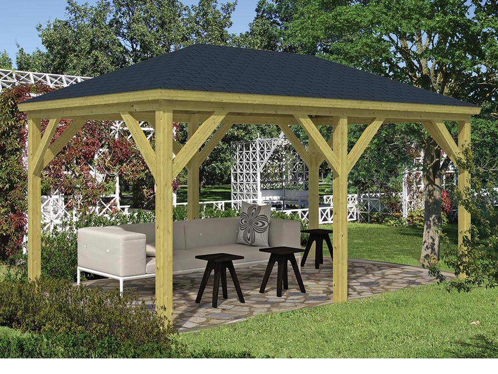 Le pavillon est fabriqué en bois de pin solide. De plus, l'imprégnation de haute qualité protège le bois de toutes les intempéries.