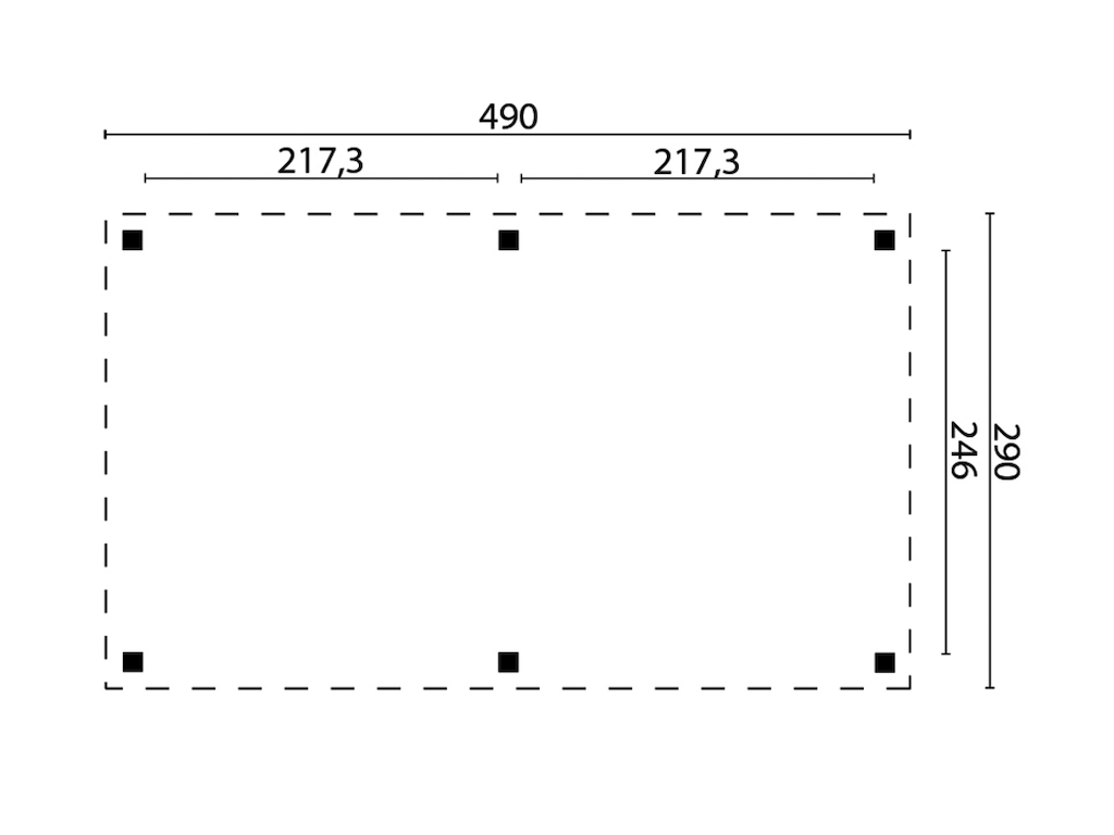 L x P x H : 490 x 290 x 290 cm, dimension du socle L x P : 470 x 270 cm, épaisseur du poteau 11,5 x 11,5 cm.