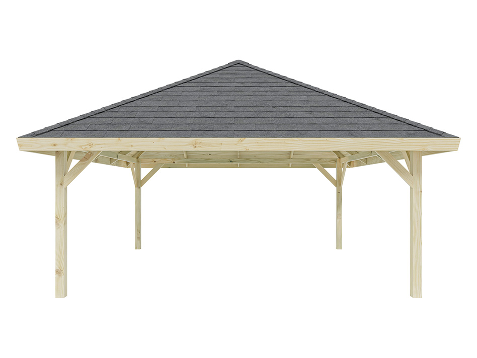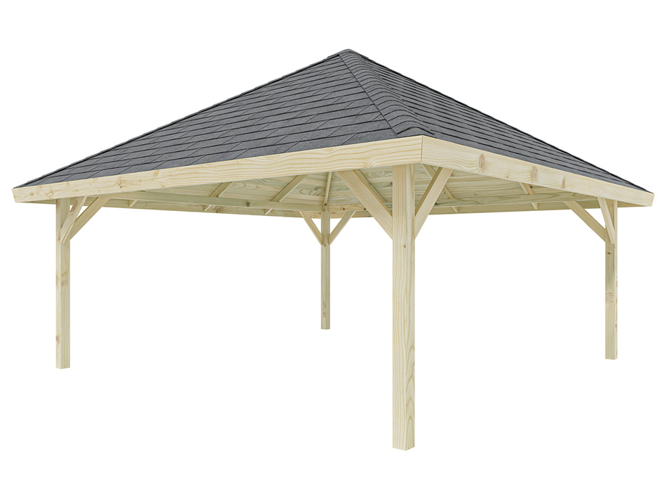 L x P x H : 560 x 560 x 375 cm, dimensions du socle L x P : 490 x 490 cm, épaisseur du poteau 11,5 x 11,5 cm.