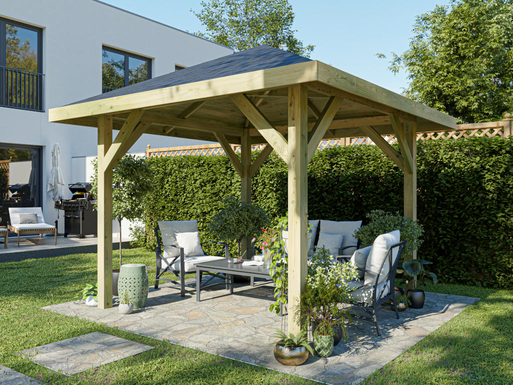 Le pavillon est fabriqué en bois de pin solide. De plus, l'imprégnation de haute qualité protège le bois de toutes les intempéries.