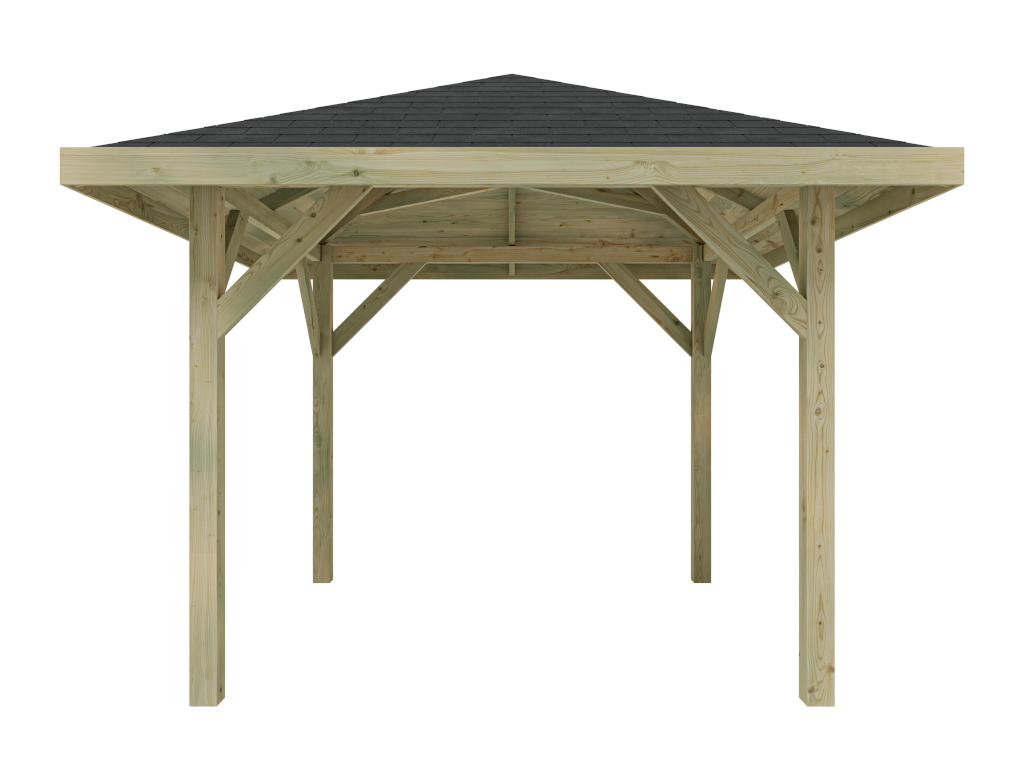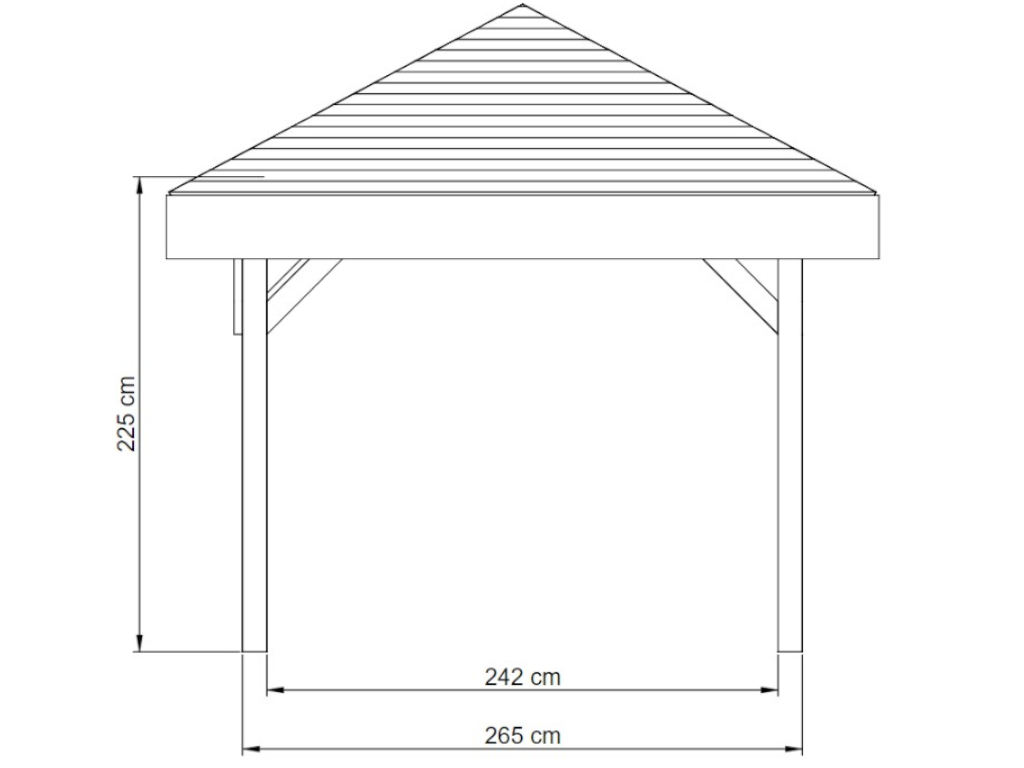 L x P x H : 338 x 338 x 305 cm, dimensions du socle L x P : 265 x 265 cm, épaisseur des poteaux 11,5 x 11,5 cm