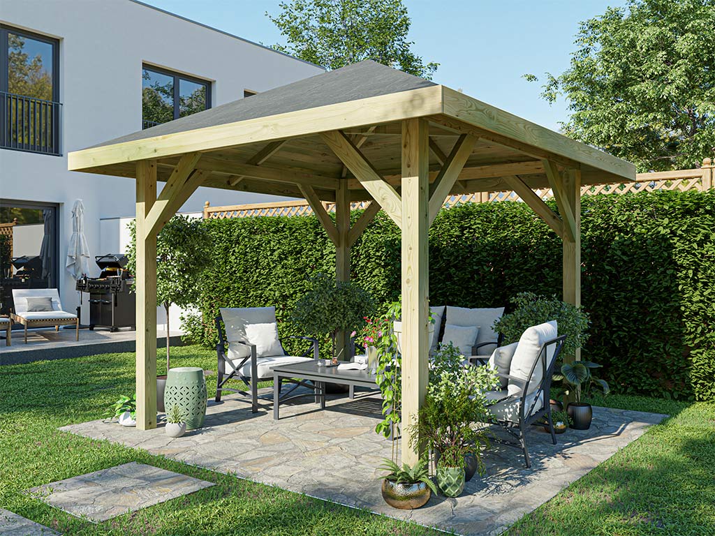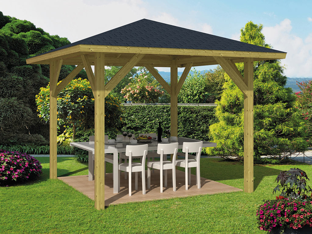 Le pavillon est fabriqué en bois de pin solide. De plus, l'imprégnation de haute qualité protège le bois de toutes les intempéries.