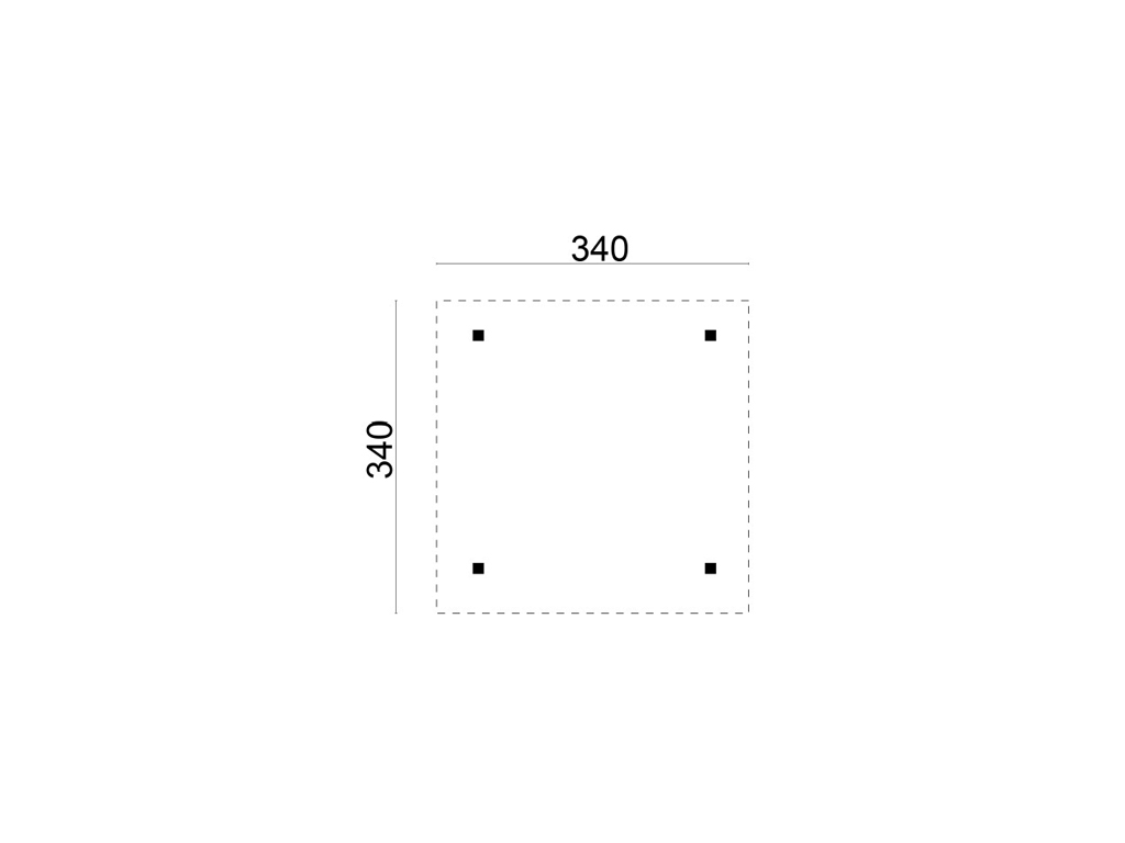 L x P x H : 338 x 338 x 305 cm, dimensions du socle L x P : 265 x 265 cm, épaisseur des poteaux 11,5 x 11,5 cm