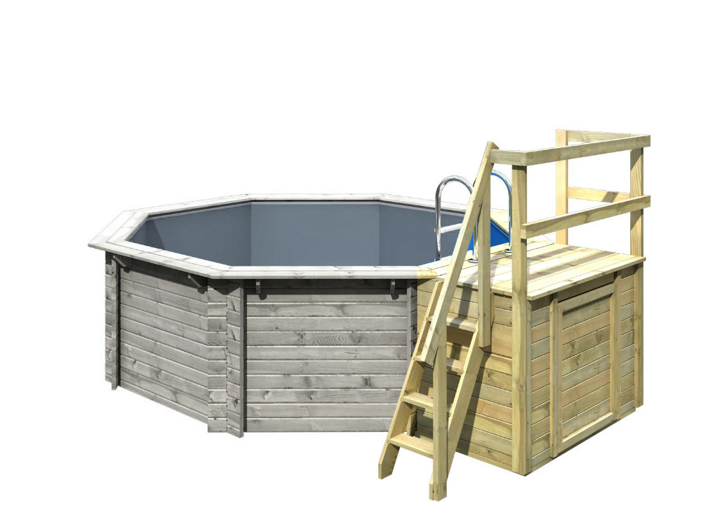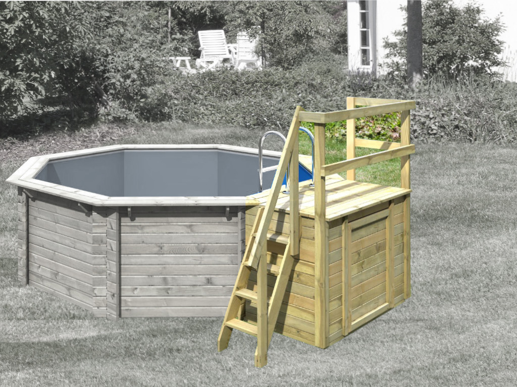 Piscine en bois modèle X1, terrasse et système de filtration inclus