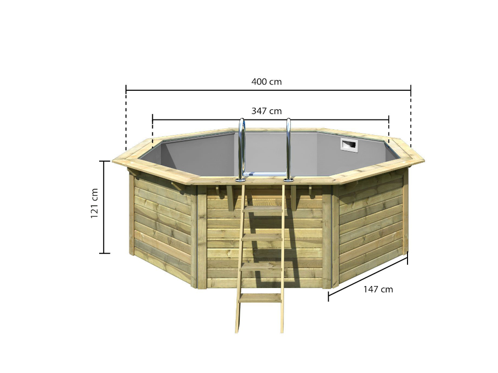 L x P x H : 400 x 400 x 124 cm, avec liner et voile de protection, imprégné sous pression.