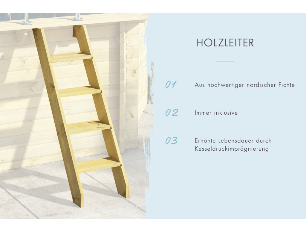 Avec sa paroi de bassin en bois, cette piscine s’intègre harmonieusement à l’aspect général naturel de votre jardin tout en donnant une impression de qualité et de solidité. Avec une épaisseur de 26 cm, la plage de piscine offre une finition attrayante sur le bord supérieur.