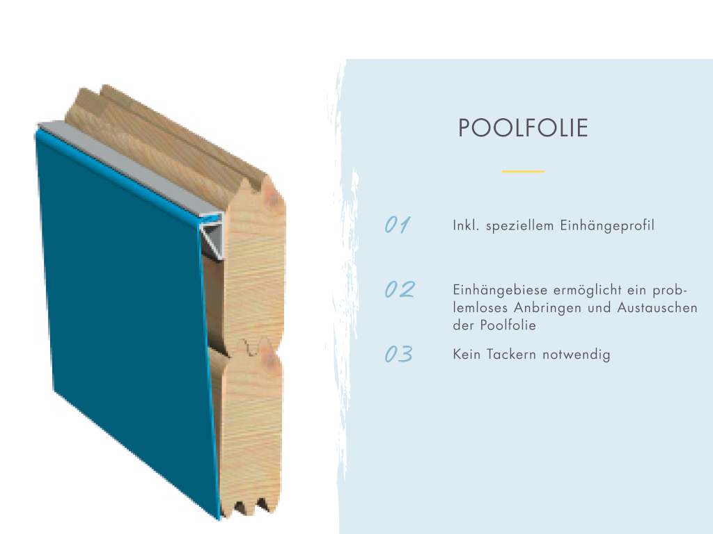 Le liner de la piscine est clipsé dans un rail Hung de haute qualité. Cela réduit les plis dans le liner et facilite le remplacement éventuel du liner.