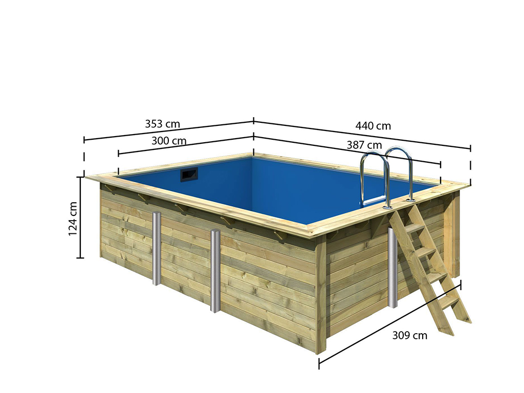 La taille généreuse de la piscine est particulièrement appréciable. Avec une largeur de 350 cm, une profondeur de 440 cm et une hauteur de 124 cm (profondeur de l'eau 111 cm), la piscine offre suffisamment d'espace pour que vous puissiez vous détendre seul avec une boisson fraîche ou avec des amis après le travail ou le week-end. La sécurité est assurée par une paroi robuste de 44 mm d'épaisseur. La piscine est conçue pour être enterrée. Un liner de piscine est également fourni, ce qui donne une sensation de confort et améliore l'aspect de l'intérieur de la piscine. De plus, le liner de piscine protège le bois et empêche l'eau de s'écouler de l'intérieur de la piscine. En même temps, votre piscine est protégée contre les intempéries, de sorte que chaque hiver peut être surmonté sans danger et que l'été suivant peut arriver. Le liner de piscine présente d'autres avantages en termes d'installation et d'entretien. Il est facile à installer et à remplacer en cas de besoin. Ainsi, la conception de la piscine en elle-même offre une flexibilité maximale à tout moment.