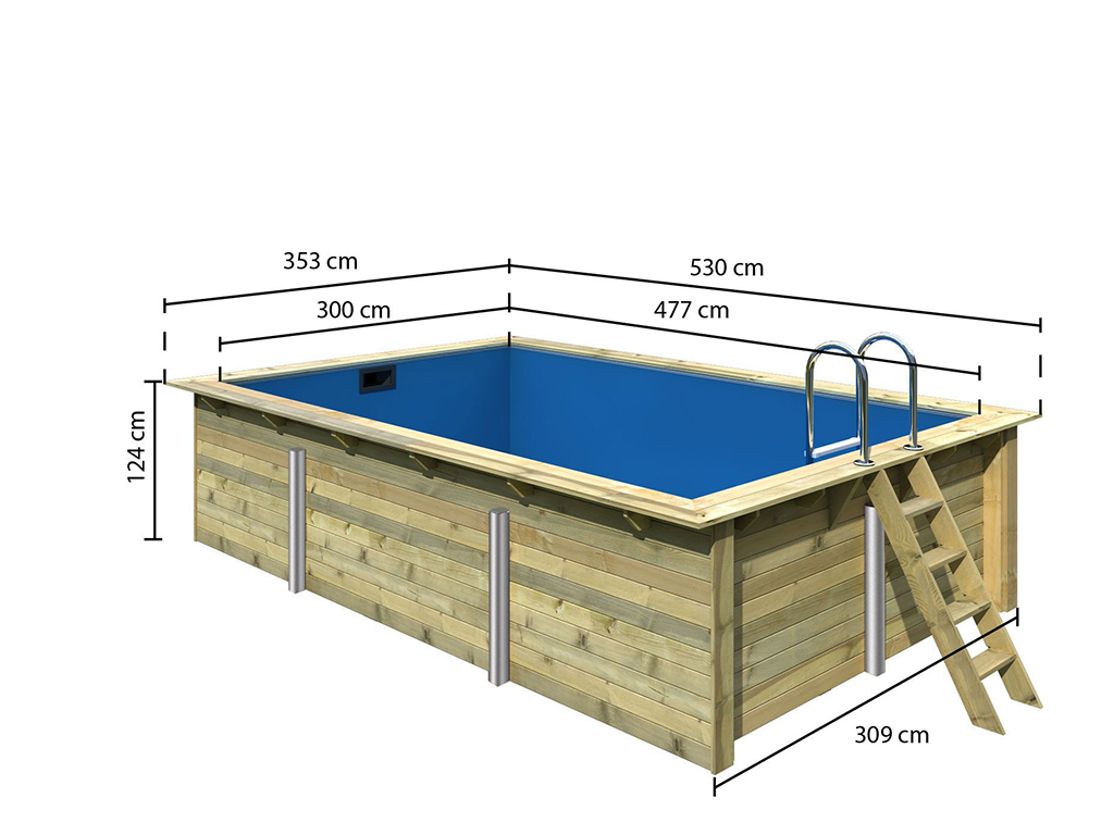 La taille généreuse de la piscine est particulièrement appréciable. Avec une largeur de 530 cm, une profondeur de 350 cm et une hauteur de 124 cm (profondeur de l'eau 111 cm), la piscine offre suffisamment d'espace pour que vous puissiez vous détendre seul avec une boisson fraîche ou avec des amis après le travail ou le week-end. La sécurité est assurée par une paroi robuste de 44 mm d'épaisseur. Un liner de piscine est également fourni, ce qui donne une sensation de confort et améliore l'aspect de l'intérieur de la piscine. De plus, le liner de piscine protège le bois et empêche l'eau de s'écouler de l'intérieur de la piscine. En même temps, votre piscine est protégée contre les intempéries, de sorte que chaque hiver peut être surmonté sans danger et que l'été suivant peut arriver. Le liner de piscine présente d'autres avantages en termes d'installation et d'entretien. Il est facile à installer et à remplacer en cas de besoin. Ainsi, la conception de la piscine en elle-même offre une flexibilité maximale à tout moment.