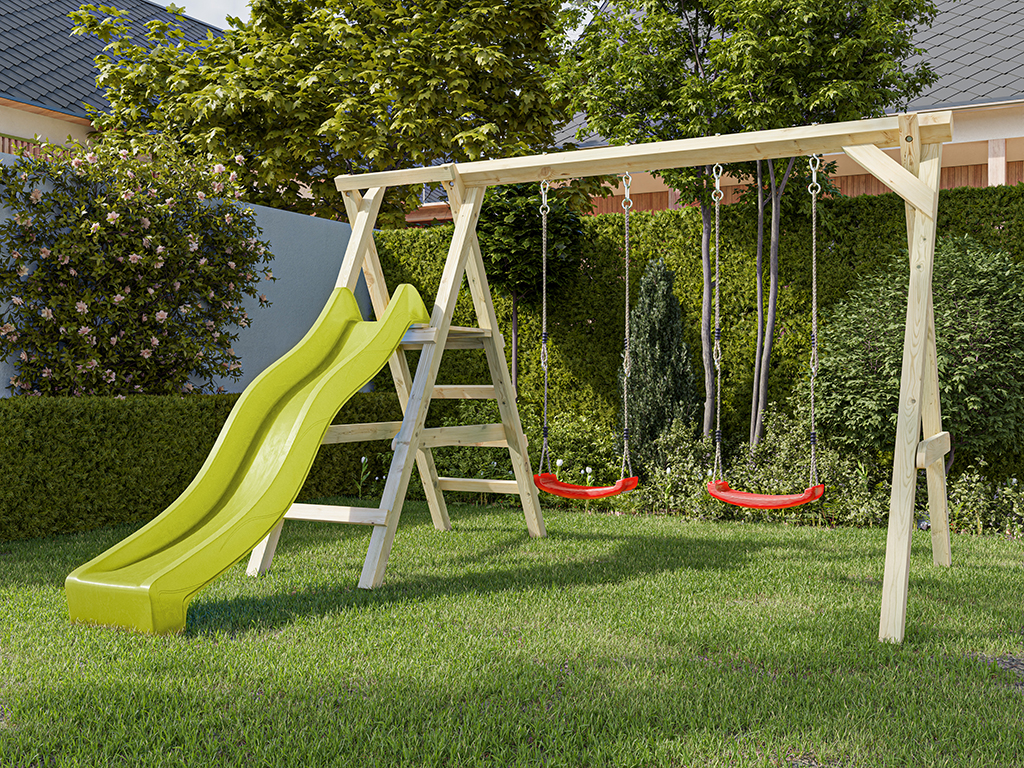 Le plaisir est garanti avec une balançoire - un incontournable de l'enfance. Se balancer est excitant et reste très populaire non seulement chez les enfants jusqu'à l'adolescence, mais aussi chez certains adultes. Et comme plus on est de fous, plus on rit, ce portique est équipé de deux balançoires, pour de nombreuses heures de plaisir partagé. L'âge recommandé pour les balançoires est de 3 à 12 ans, mais il n'y a pas de limite d'âge pour profiter du sentiment de légèreté et de liberté. Pour ceux qui ne veulent pas faire de compromis entre se balancer ou glisser, ce modèle est le bon choix, car il inclut un toboggan et 2 balançoires - pour un plaisir de jeu maximal. La hauteur de la plateforme est de 120 cm.