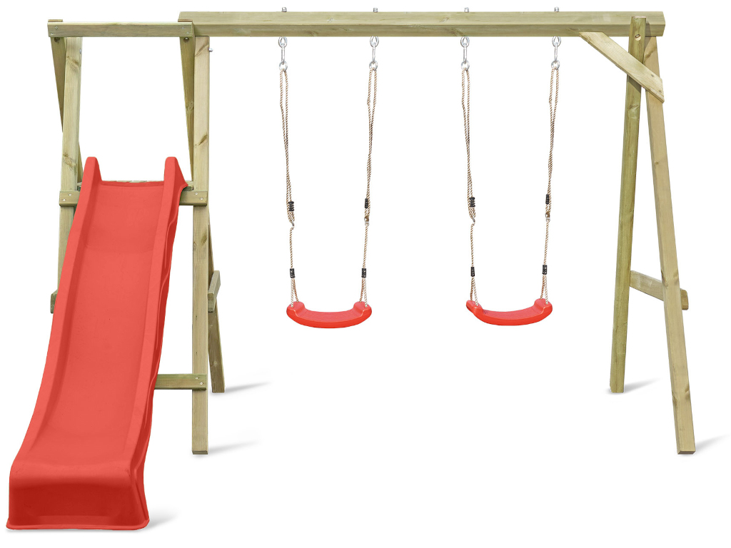 Portique double avec plateforme Cosy Double en bois autoclave avec toboggan rouge et 2 balançoires r