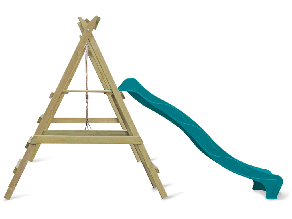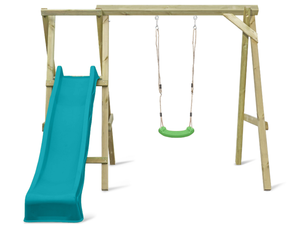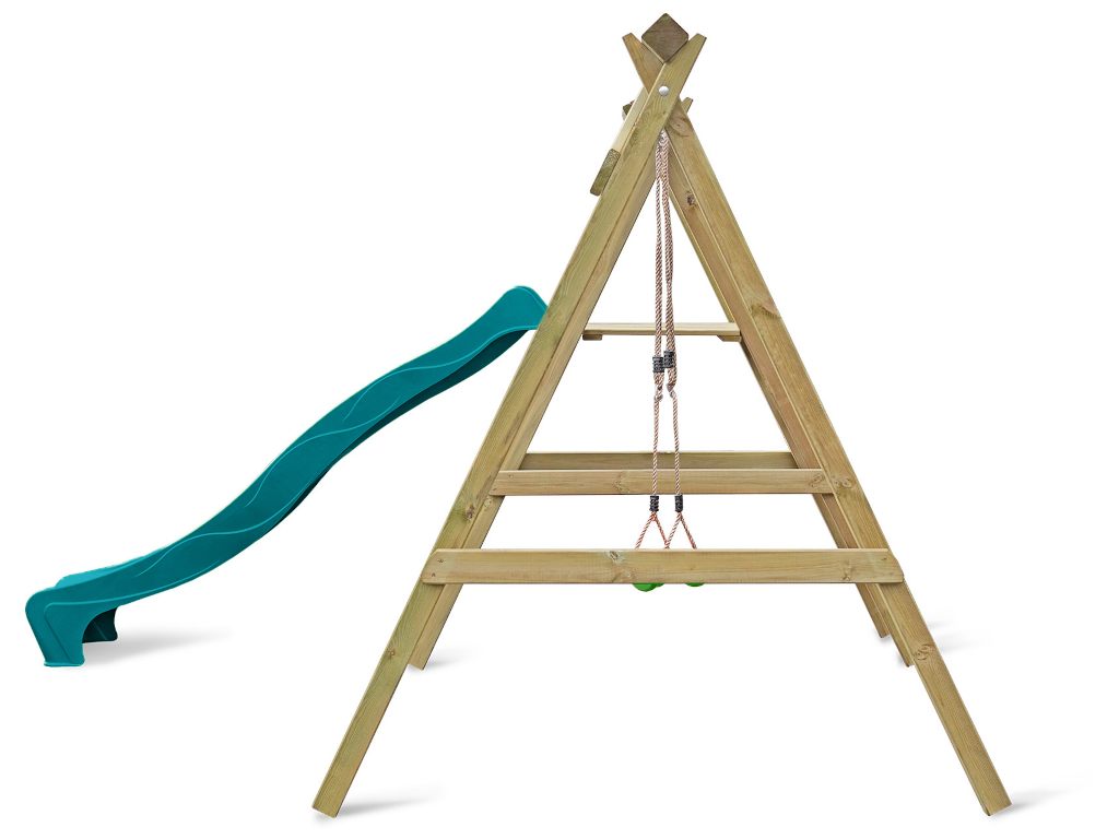 Portique simple avec plateforme Cosy Single avec toboggan turquoise + balançoire verte