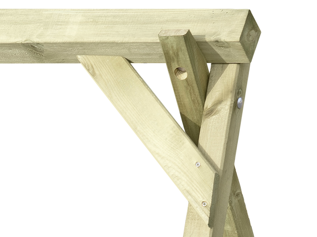Ce portique est fabriqué en bois. Cette matière naturelle est parfaite pour les équipements de jeux pour enfants - résistante et durable. Pour sa fabrication, du bois de pin de première qualité a été utilisé, il se distingue par sa résistance et sa robustesse.