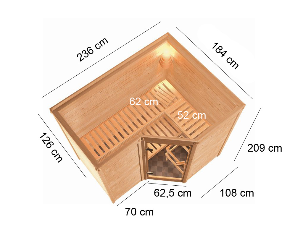 - Bancs de sauna : Avec 3 bancs, l'expérience est particulièrement agréable pour chaque client du sauna. Les bancs suivants sont inclus dans l'équipement de base : 1 banc de 62 cm de large, 1 banc de 57 cm de large, 1 banc de 52 cm de large, en tremble massif.