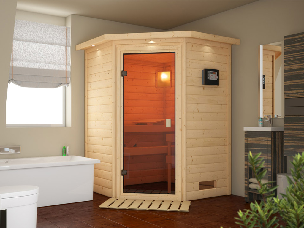 Sauna en bois massif KARIBU « Stefanie » pour 1–2 personnes avec poêle de sauna 3,6 kW P&P et unité de contrôle P&P finlandaise