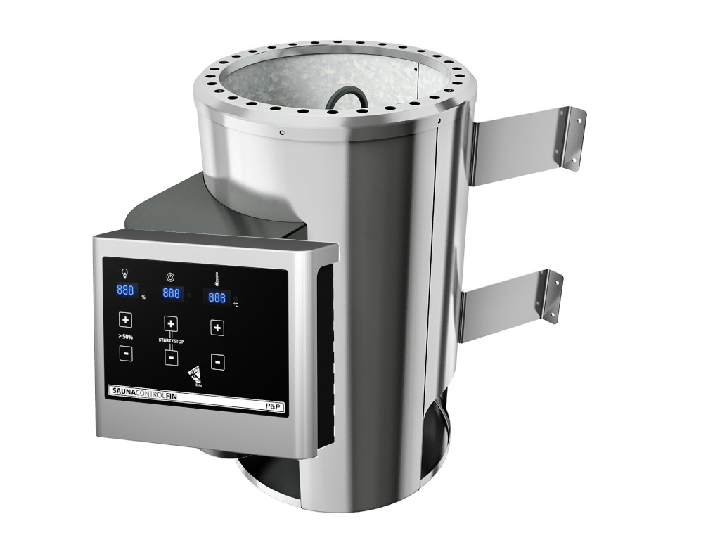 Poêle de sauna P&P, unité de contrôle finlandaise, 2 bancs en épicéa, grille de protection du poêle en épicéa massif (L 60 x P 51 x H 80 cm), ferrures et notice de montage.