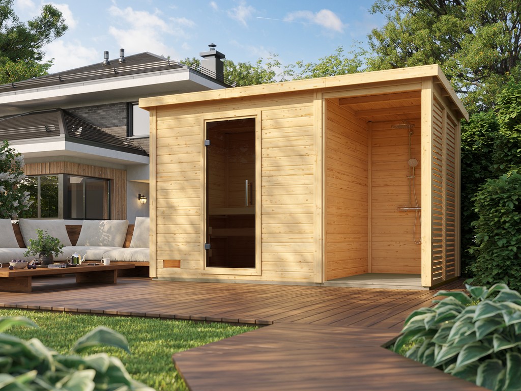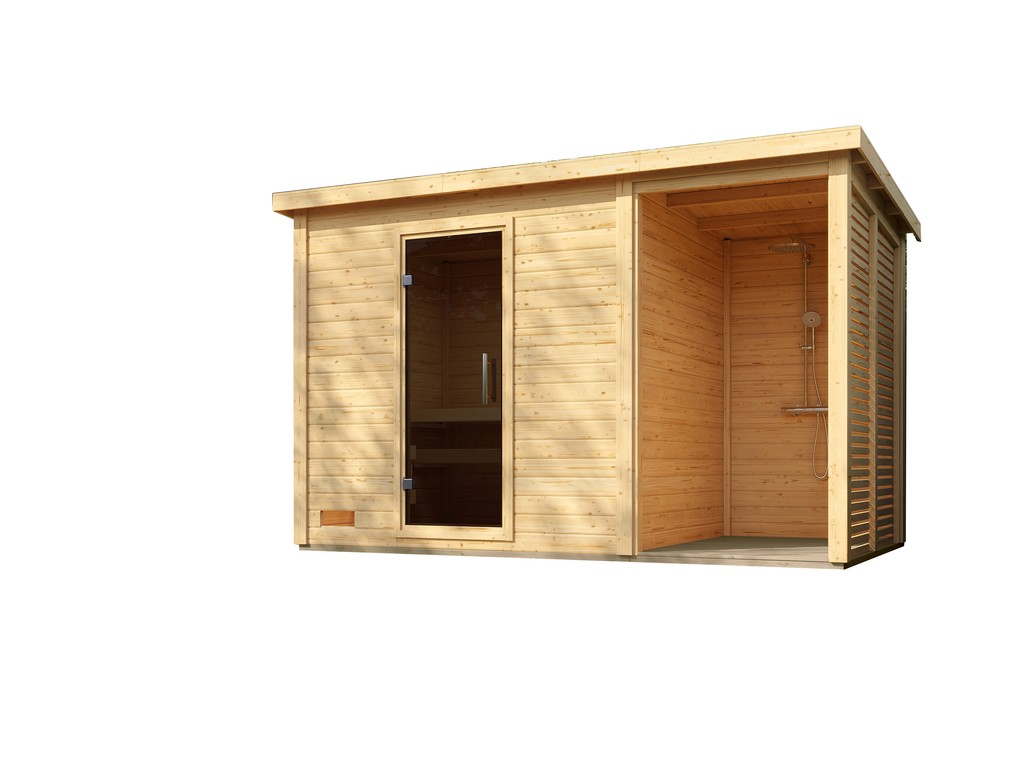Sauna extérieur KARIBU "Lene 3" brut 38 mm avec extension douche et porte en verre graphite