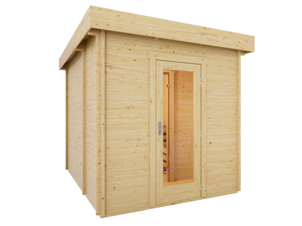Ce modèle – un Sauna modulaire, c’est‑à‑dire un Sauna avec éléments préfabriqués – se distingue par sa construction sandwich particulière, c’est‑à‑dire que les éléments de paroi sont composés de plusieurs couches. Les éléments de paroi préfabriqués en Épicéa permettent un montage rapide en quelques heures seulement. Avec une épaisseur de paroi de 40 mm, les Saunas modulaires sont idéalement isolés et donc particulièrement économes en énergie. Grâce aux éléments très bien isolés, ce Sauna modulaire chauffe particulièrement vite.
