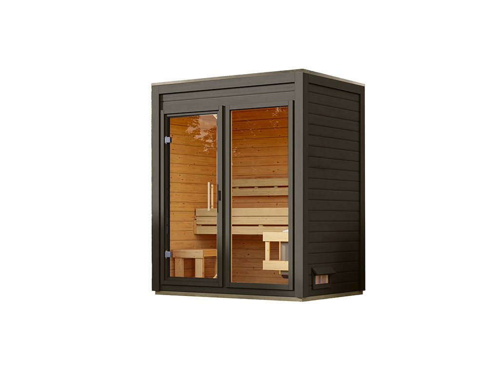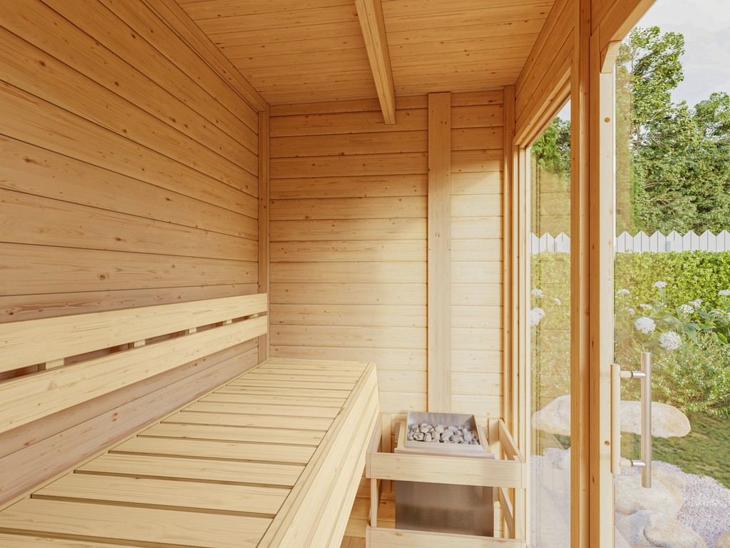 Ce modèle de sauna – un sauna modulaire ou avec éléments préfabriqués – se distingue par sa construction en sandwich particulière, c’est-à-dire que les éléments de paroi sont composés de différentes couches. Les éléments de paroi pré-assemblés en épicéa permettent un montage rapide en quelques heures seulement. Avec une épaisseur de paroi de 38 mm, les saunas modulaires sont parfaitement isolés, ce qui les rend particulièrement économes en énergie. Grâce à ces éléments très bien isolés, le sauna modulaire chauffe très rapidement.