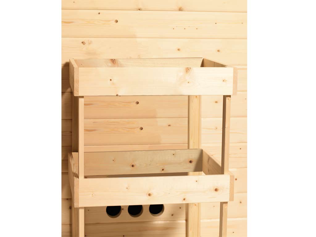 Les deux bancs stables en tremble augmentent le confort de ce sauna intérieur. De plus, une grille de protection du poêle en épicéa massif et un plancher en bois massif sont inclus dans la livraison. Le vestiaire intégré est parfait pour se changer ou pour ranger les accessoires du sauna. L’isolation en laine minérale dans la couverture du sauna assure en outre une faible consommation d’énergie. Avec instructions de montage - Porte entièrement en verre transparent