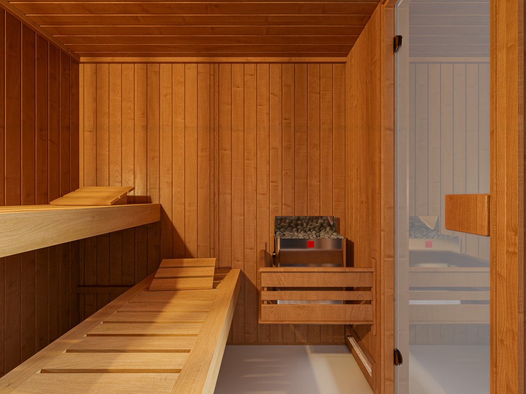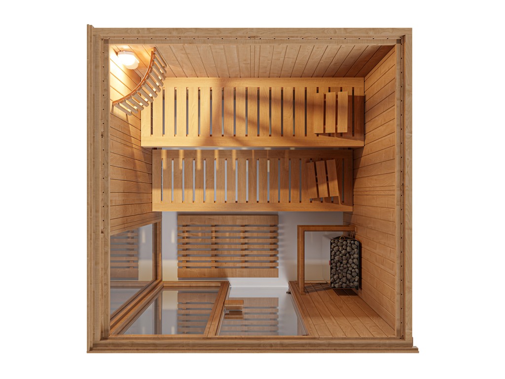 Banquettes de sauna : avec 2 banquettes, votre séance de sauna devient particulièrement confortable. Les bancs de sauna suivants sont fournis : 2 banquettes d’environ 55 cm de large.